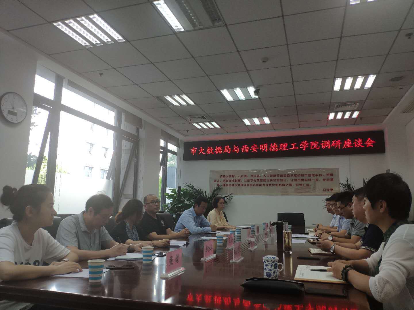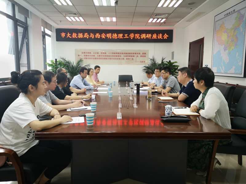7月16日上午,我院张渤院长一行7人前往西安市大数据管理局调研交流。西安市大数据局局长刘军出席接待。调研交流会在西安市大数据管理局会议室召开。明德学院党委副书记董昊、院长助理兼学院办公室主任支晓、信息工程学院教师詹金珍、令前华、张健和张伟岗以及西安市大数据局办公室主任傅强、数据产业处处长曹康、新经济发展处处长吴亚庆、西安市12345热线服务中心负责人王斌也出席了会议。
