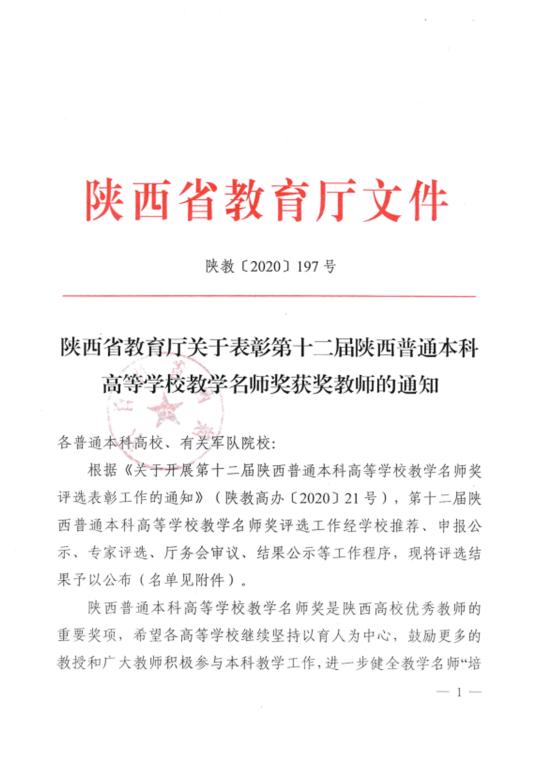 陕西省普通本科高等学校教学名师奖是陕西高校优秀教师的重要奖项,教学名师奖的评选表彰是加强教师队伍建设,引导广大教师投身教学、钻研教学、潜心育人、提高人才培养质量的重要举措。