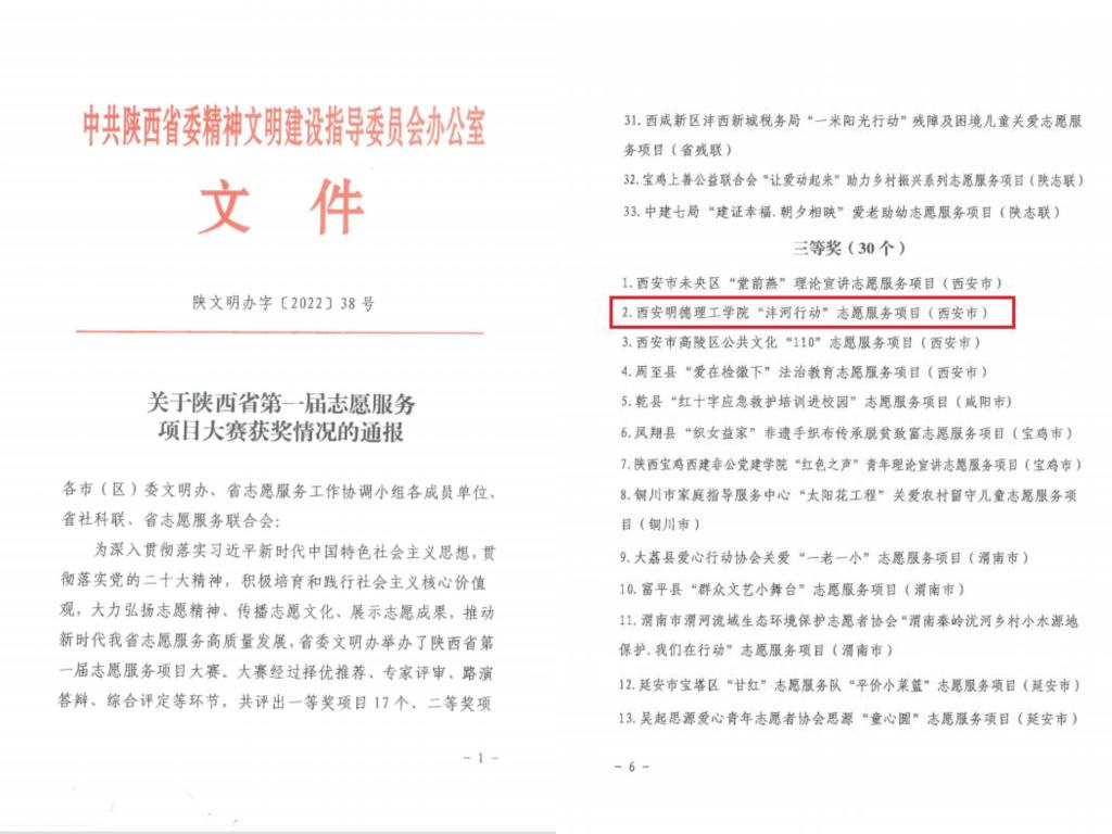 为深入贯彻落实习近平新时代中国特色社会主义思想,贯彻落实党的二十大精神,积极培育和践行社会主义核心价值观,大力弘扬志愿精神、传播志愿文化、展示志愿成果,推动新时代我省志愿服务高质量发展,中共陕西省委宣传部、陕西省委文明办举办了“陕西省第一届志愿服务项目大赛”。大赛经过择优推荐、专家评审、路演答辩、综合评定等环节,共评出一等奖项目17个、二等奖项目33个、三等奖项目30个、优秀奖项目76个。开元团委实施的“沣河行动”志愿服务项目荣获三等奖。