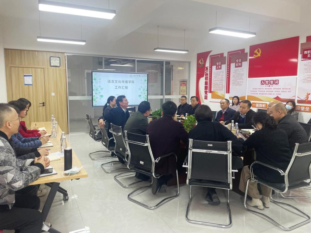 2月28日上午,学校常务副校长王志刚,学校办公室、教务处、人力资源处、党委学生工作部、质量管理与评估办公室、科研与校企合作处、教学研究与教师发展中心负责人等一行到语言文化传播学院调研指导,学院领导班子、专业负责人参加会议,会议由人力资源处处长白秦川主持。
