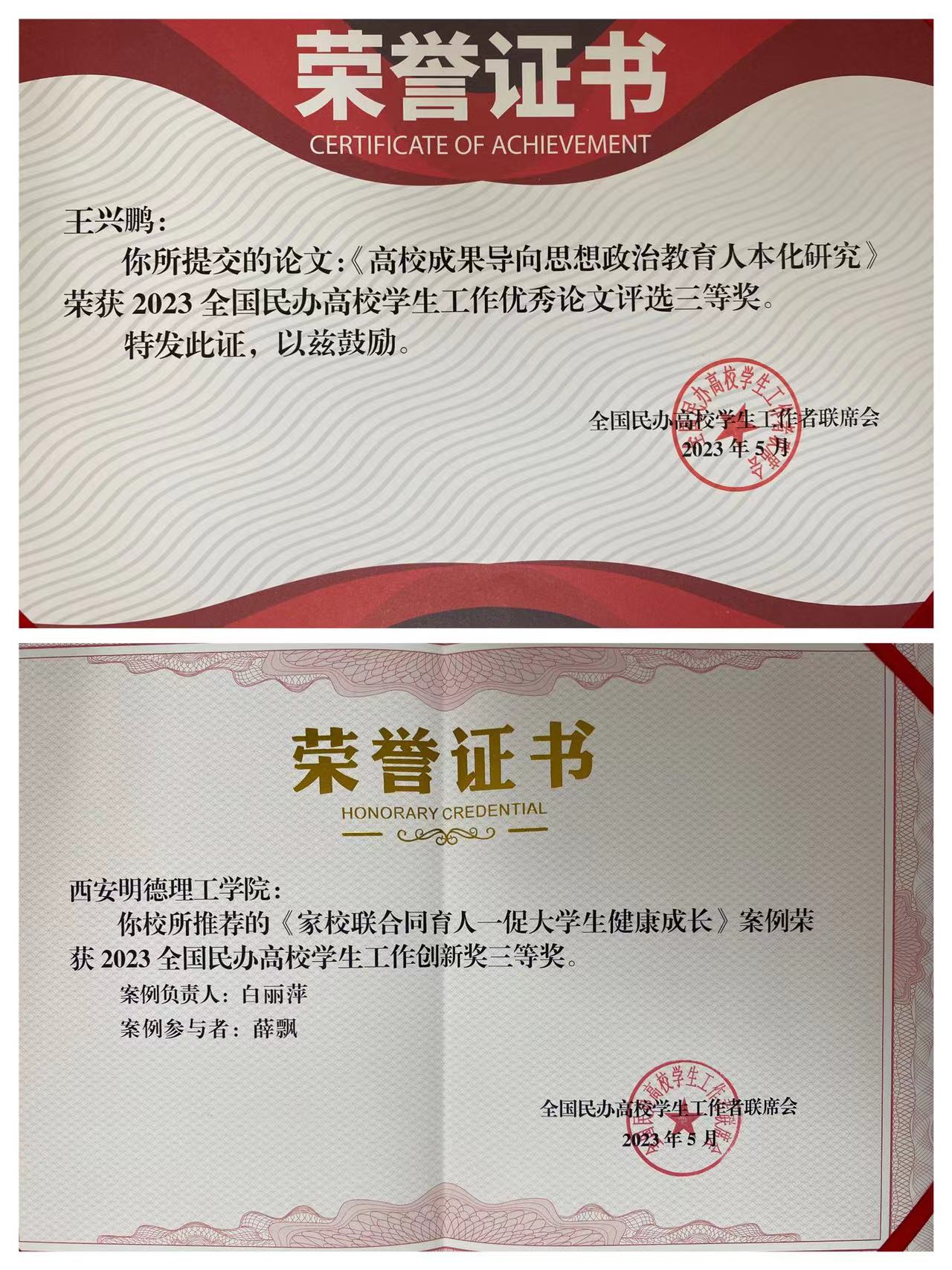 5月11日至12日,第十届全国民办高校学生工作创新研讨会在湖北武汉隆重召开。学校申报的《高校成果导向思想政治教育人本化研究》荣获2023年全国民办高校学生工作优秀论文评选三等奖,《家校联合同育人——促大学生健康成长》荣获2023年全国民办高校学生工作创新奖三等奖。