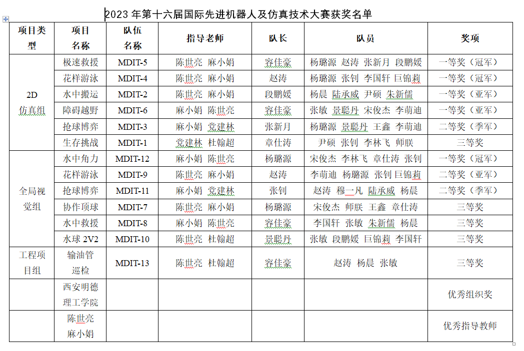 9月20日至22日,2023年第十六届国际先进机器人及仿真技术大赛-青岛站比赛在青岛国际博览中心举行,由开元信息工程学院同学组成的代表队同心协力、奋勇拼搏、不畏强手,共获一等奖5项、二等奖3项、三等奖5项,其中“2D仿真花样游泳、2D仿真急速救援、全局视觉水中角力”3个项目勇夺冠军,取得了学校参加该赛事以来的最好成绩。