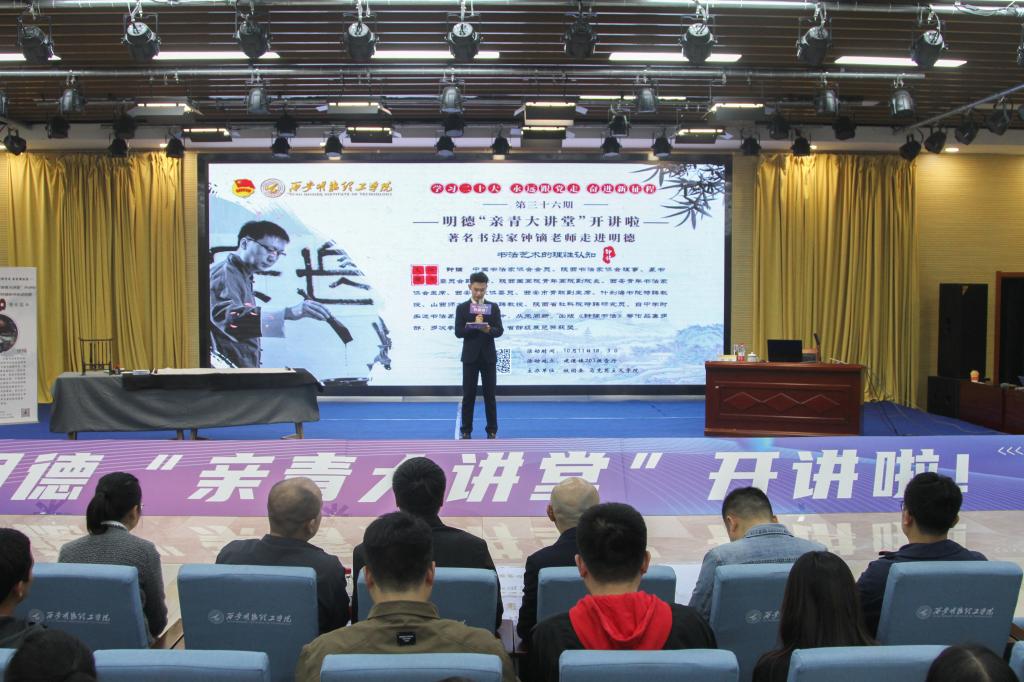书法艺术承载着中华文化的深厚内蕴,是民族优秀传统的瑰宝。为引领明德学子对书法的认知,提升学生汉字书写水平,丰富精神文化修养。10月11日晚,第36期明德“亲青大讲堂”在建德楼203报告厅顺利开展。著名书法家钟镝走进明德,与开元师生共同探讨书法艺术的理性认知。报告前,学校党委副书记董昊热情接待了钟镝老师,并代表学校为钟镝老师颁发了艺术指导专家聘书。