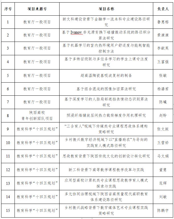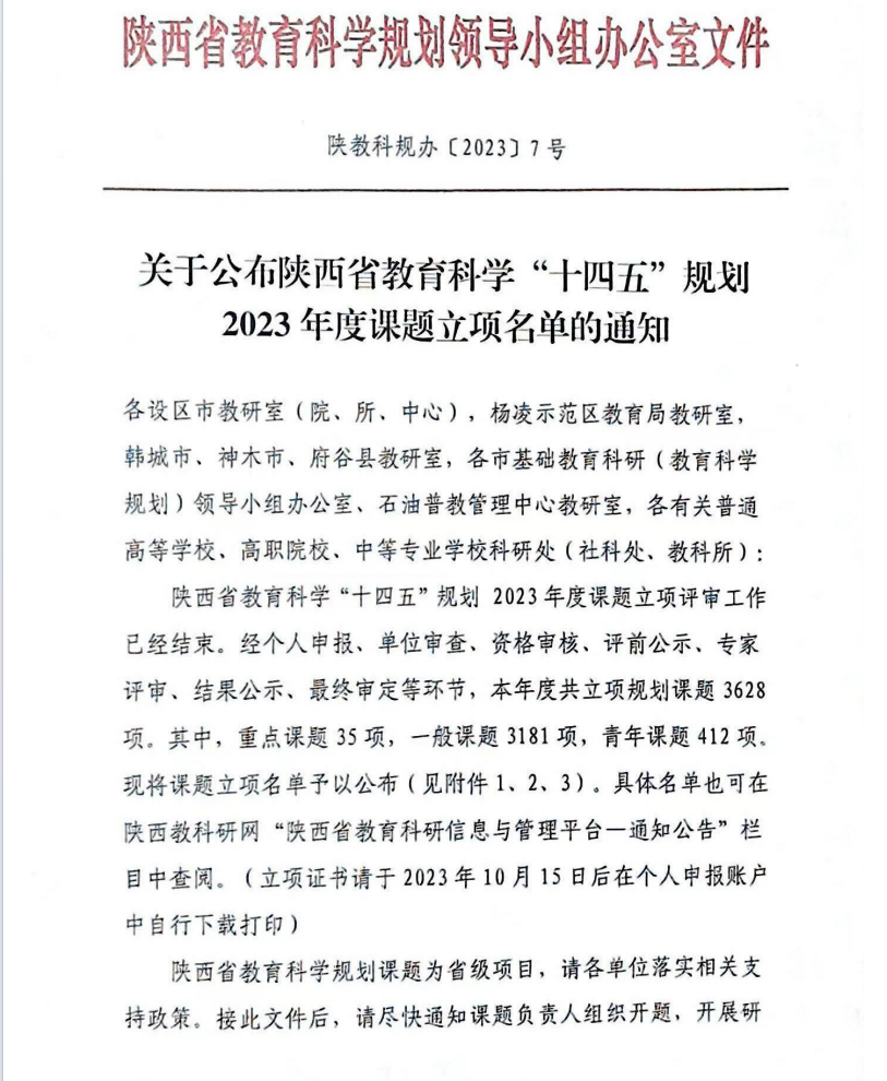 近日,陕西省教育厅发布了《关于印发2023年度科学研究计划项目的通知》(陕教函〔2023〕1170号)、《关于公布陕西省教育科学“十四五”规划2023年度课题立项名单的通知》(陕教科规办〔2023〕7号)。开元推荐申报的8项课题获批陕西省教育厅2023年度科学研究计划项目立项,其中,一般专项项目7项,青年创新团队项目1项;7项课题获批陕西省教育科学“十四五”规划2023年度课题立项。两批次共立项15项省级科研项目。名单如下: