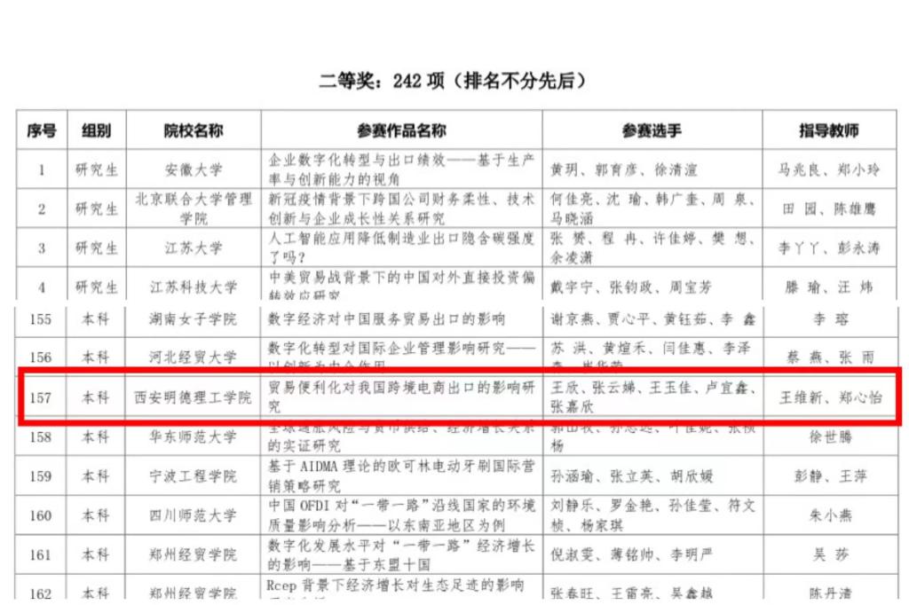 国际贸易与商务专题赛道主要面向国际经济与贸易专业或相关专业的研究生、本科学生和高职学生的理论研究型竞赛,通过论文写作方式,考察学生的理论功底、学科素养、写作水平、团队协作等能力。参赛团队结合当前国际经贸政策、国际财务金融、国际企业管理、国际营销和自由贸易协定应用等热点,选择其中一个主题,依据规定格式撰写一篇不少于2万字的应用研究型论文。经过专业教师地耐心指导、多次打磨修改,经济与管理学院学生王萍儿、韩梦琦、尹佳红和李跃的《数字普惠金融背景下农村跨境电商的发展机遇及对策研究》一文荣获一等奖。