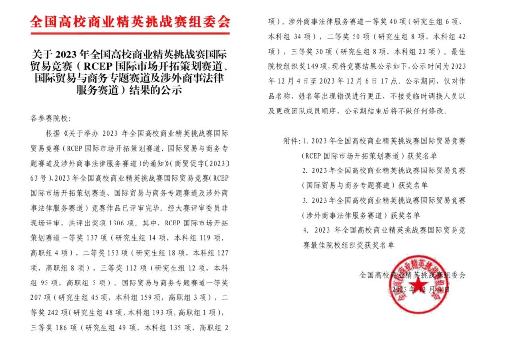 由中国国际贸易促进委员会商业行业委员会、中国国际商会商业行业商会和中国商业经济学会主办的2023年全国高校商业精英挑战赛国际贸易竞赛(国际贸易与商务专题赛道)近期圆满结束,经济与管理学院国际经济与贸易专业团队教师组织4支队伍参加本次比赛,最终获得国家级一等奖1项、二等奖1项、三等奖2项,学校荣获最佳院校组织奖,为学院学科竞赛再添新荣誉。