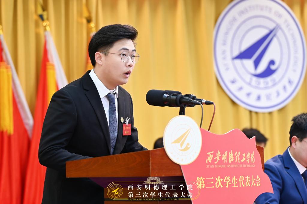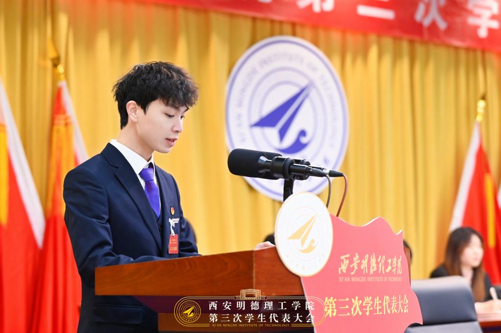 陕西省学生联合会驻会执行主席王俊驰同学致辞,并对大会的召开表示祝贺,希望明德学生会坚定不移听党话、跟党走,切实把党的创新理论贯彻落实到学生会组织日常工作中,打造有政治高度、有情感温度、大局贡献度、有工作力度的学生会。