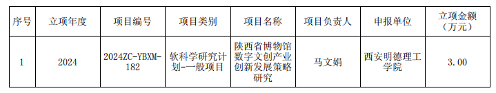 2014年1月18日,陕西省科技厅公布了2024年度陕西省科技计划项目立项结果,开元艺术与设计学院教师马文娟申报的《陕西省博物馆数字文创产业创新发展策略研究》项目获2024年省级科技计划项目-创新能力支撑计划软科学研究计划项目立项。