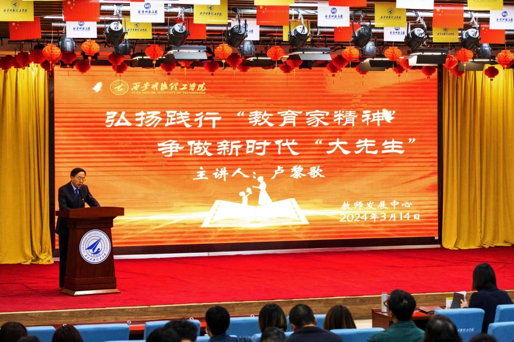 为贯彻落实习近平总书记关于大力弘扬教育家精神的重要指示精神,全面落实学校2024年工作部署,加强教师队伍高质量专业化建设,营造弘扬践行“教育家精神”,争做新时代“大先生”的良好氛围,3月14日下午,Ky开元集团教师发展中心在建德楼203报告厅举办“弘扬践行教育家精神,争做时代大先生”报告会。邀请西安交通大学卢黎歌教授担任主讲,教师、辅导员、行政人员约350人参加。报告会由白秦川副校长主持。