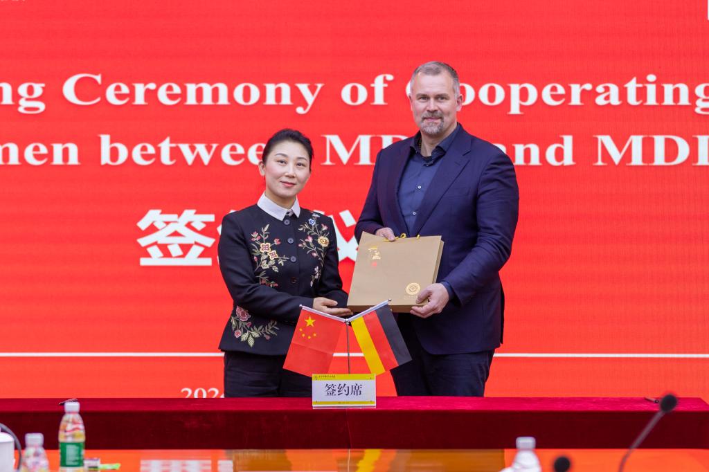 王志刚校长代表学校与马丁·亚当(Martin Adam)签署了校际合作协议。张琳副董事长为德方代表团一行赠送开元非遗文创礼物。