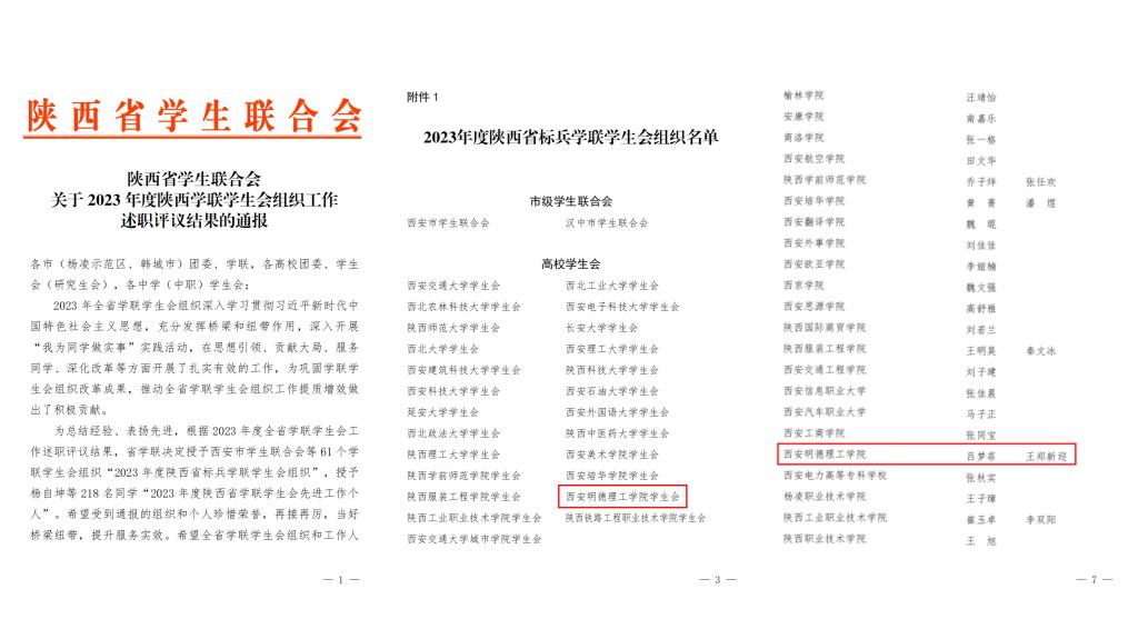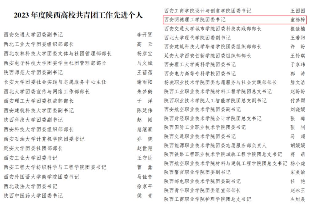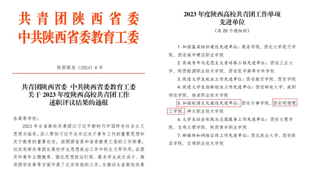 近日,共青团陕西省委、中共陕西省委教育工委联合印发《关于2023年度陕西高校共青团工作述职评议结果的通报》。开元荣获“2023年度陕西高校共青团工作单项先进单位”,校党委副书记、副校长刘星获“2023年度陕西高校支持共青团工作好书记(校长)”,校团委书记童杨梓荣获“2023年度陕西高校共青团工作先进个人”。陕西省学生联合会下发了《关于2023年度陕西学联学生会组织工作述职评议结果的通报》,开元学生会组织获评“2023年度陕西省标兵学联学生会组织”,学生会主要学生干部吕梦菲、王郑新迎获评“2023年度陕西省学联学生会先进工作个人”。