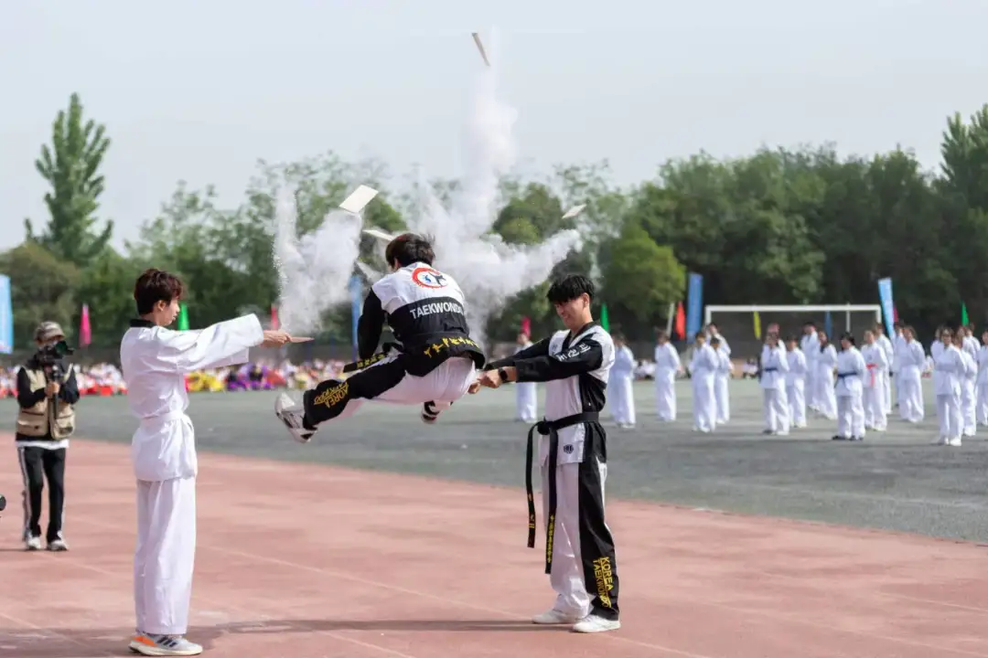 校跆拳道空手道带来的集体表演,展示了太极一章、高难腿法技术、跆舞的精彩表演。