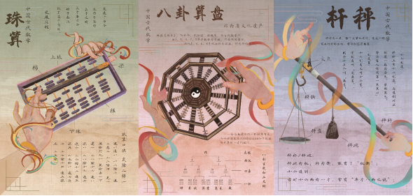 值得一提的是此次大赛西北地区赛一等奖获得者,赵思语和李鑫两位同学,以古代珠算、八卦算盘和秤杆为元素,通过计算机绘画呈现出画面与内涵并存的系列海报设计。