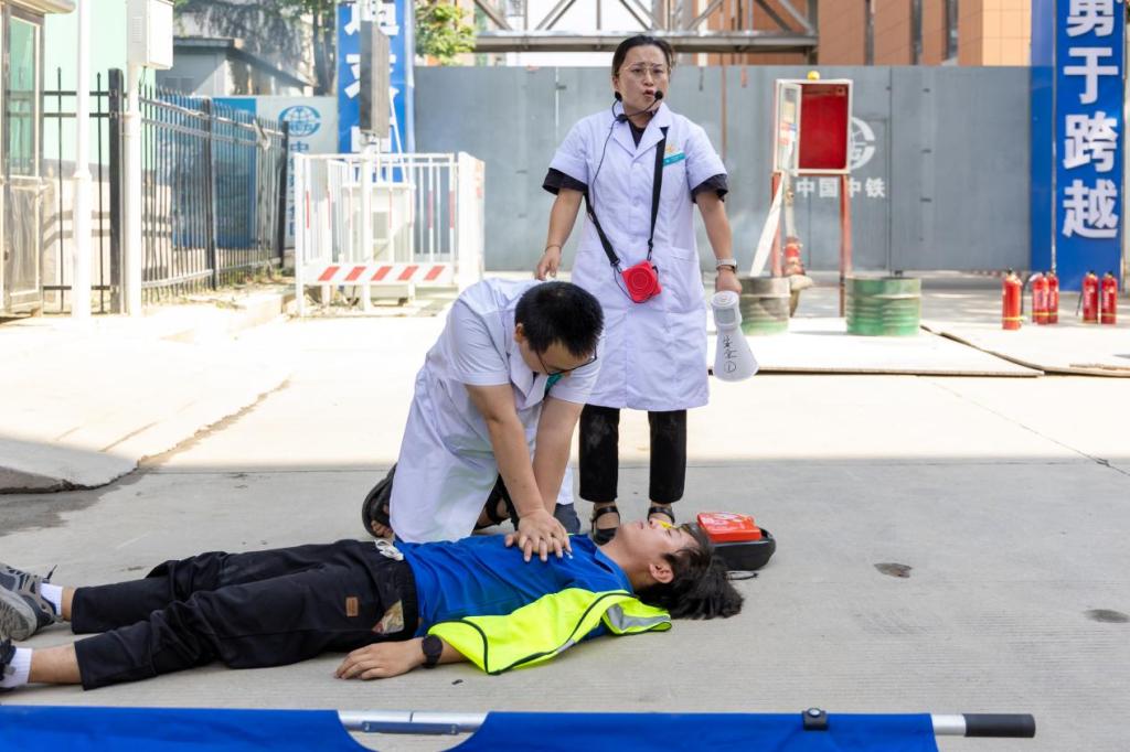 演练过程中,首先进行了消防应急演练。通过模拟工地现场突发火灾的情景,参与人员迅速启动应急预案,熟练使用灭火器材进行初期火灾扑救,并有序组织现场人员疏散。随后,开展了触电急救应急演练。在模拟工人触电倒地的情境中,现场人员迅速切断电源,对触电者实施心肺复苏等急救措施,同时拨打急救电话等待专业救援。此外,鉴于近期持续高温天气,校医院赵医生还为现场工友们详细讲解了中暑预防措施及中暑后的急救方法。