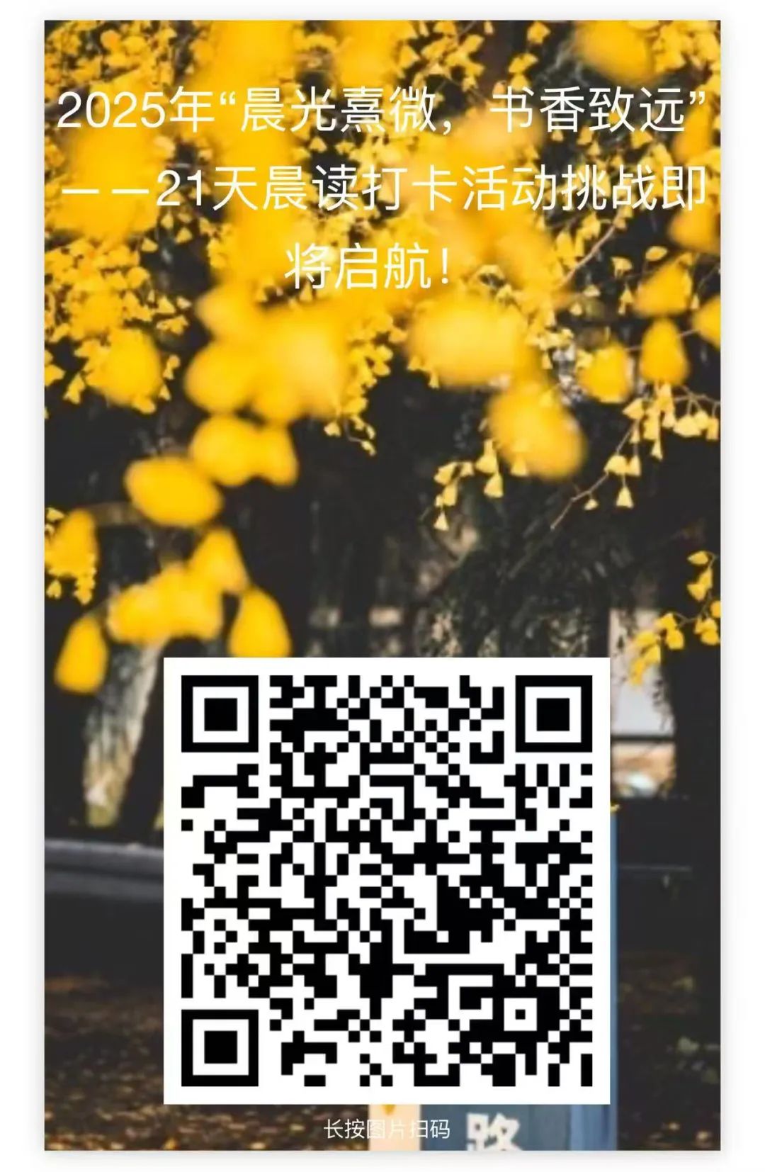 同学们,21天可以养成一个好习惯,快来参加“晨光熹微,书香致远”晨读打卡活动,在清晨的校园里开启知识的大门,提升自我,收获成长!期待在活动中看到你的身影,一起用朗朗书声迎接每一个美好的早晨!