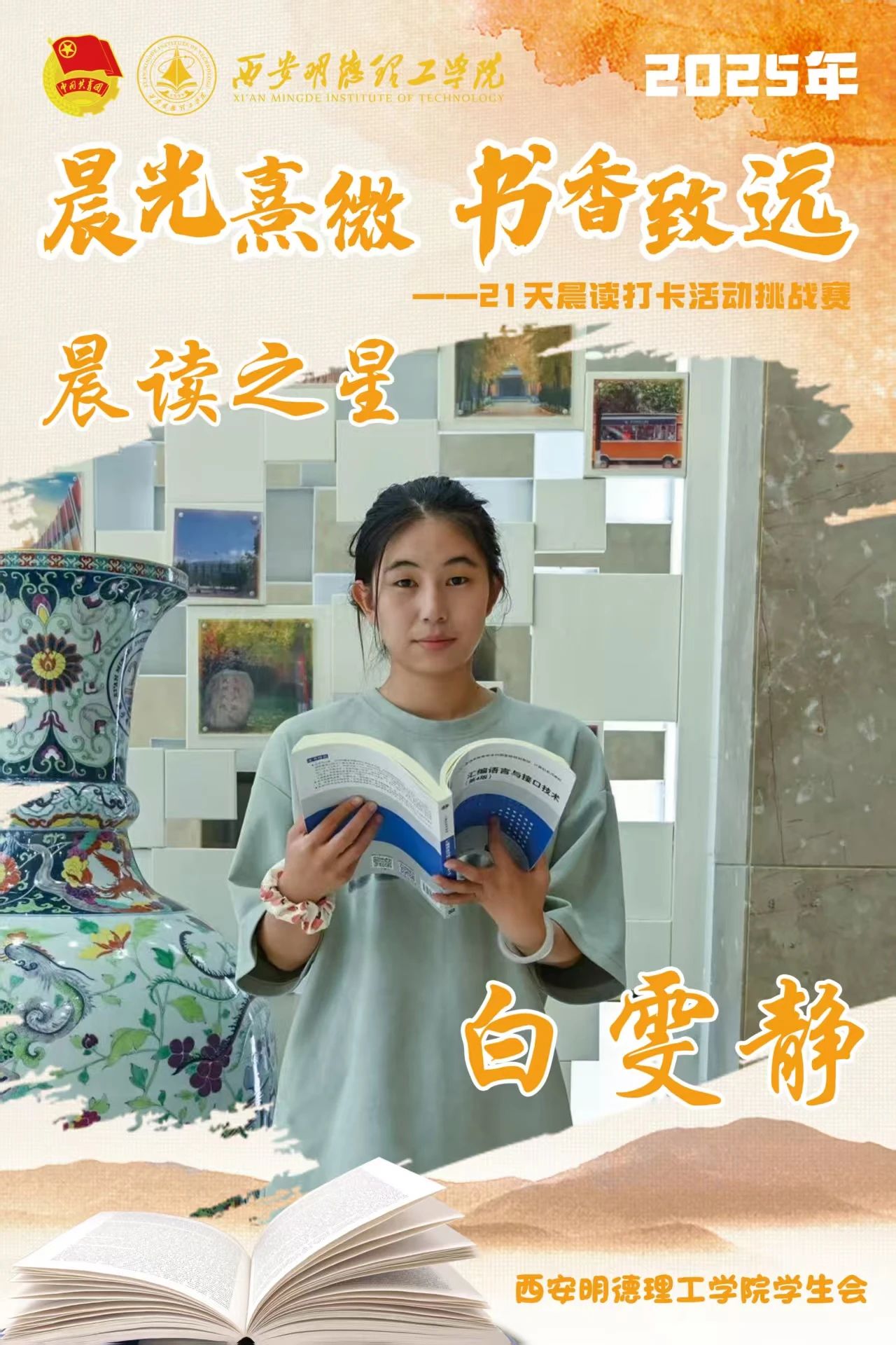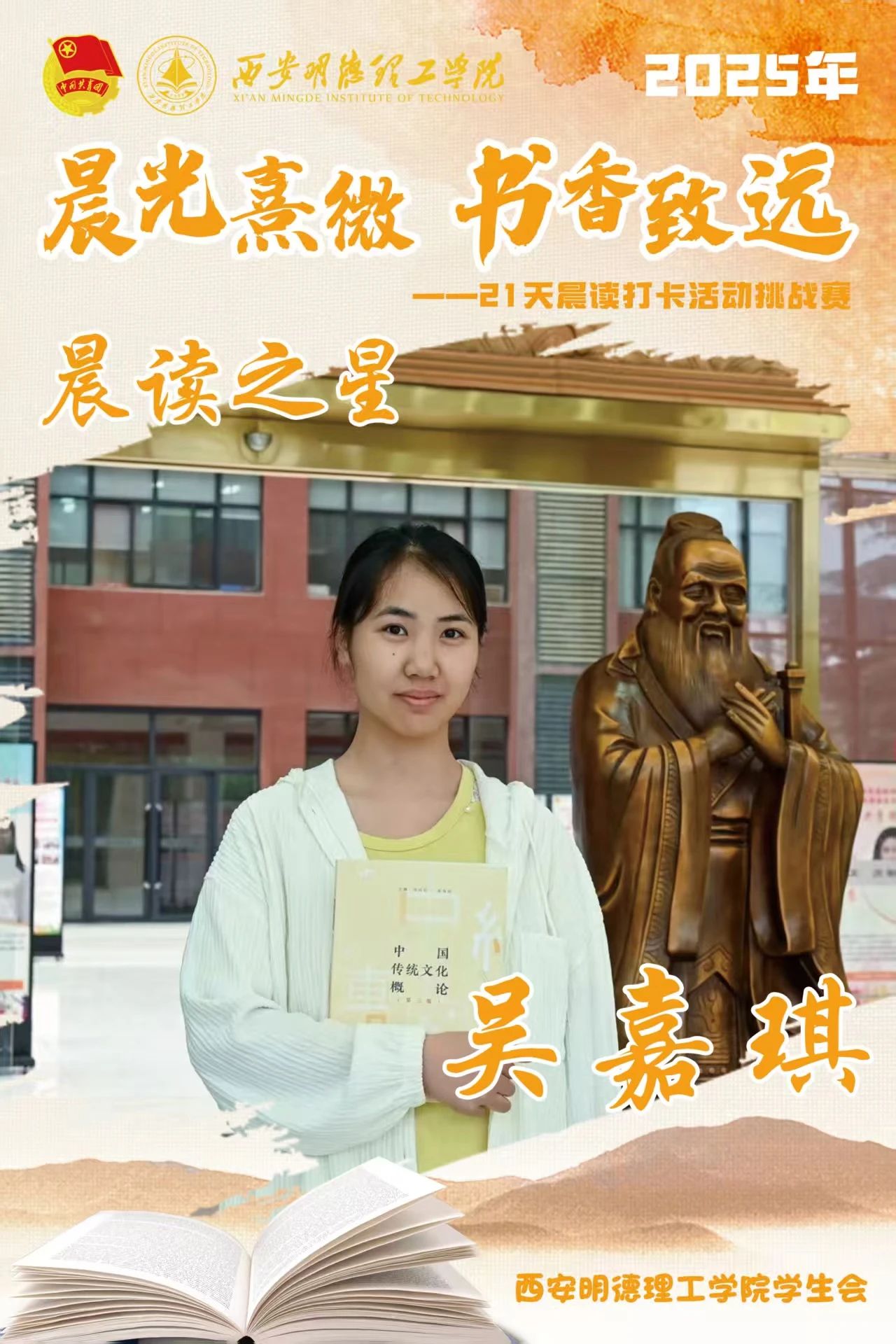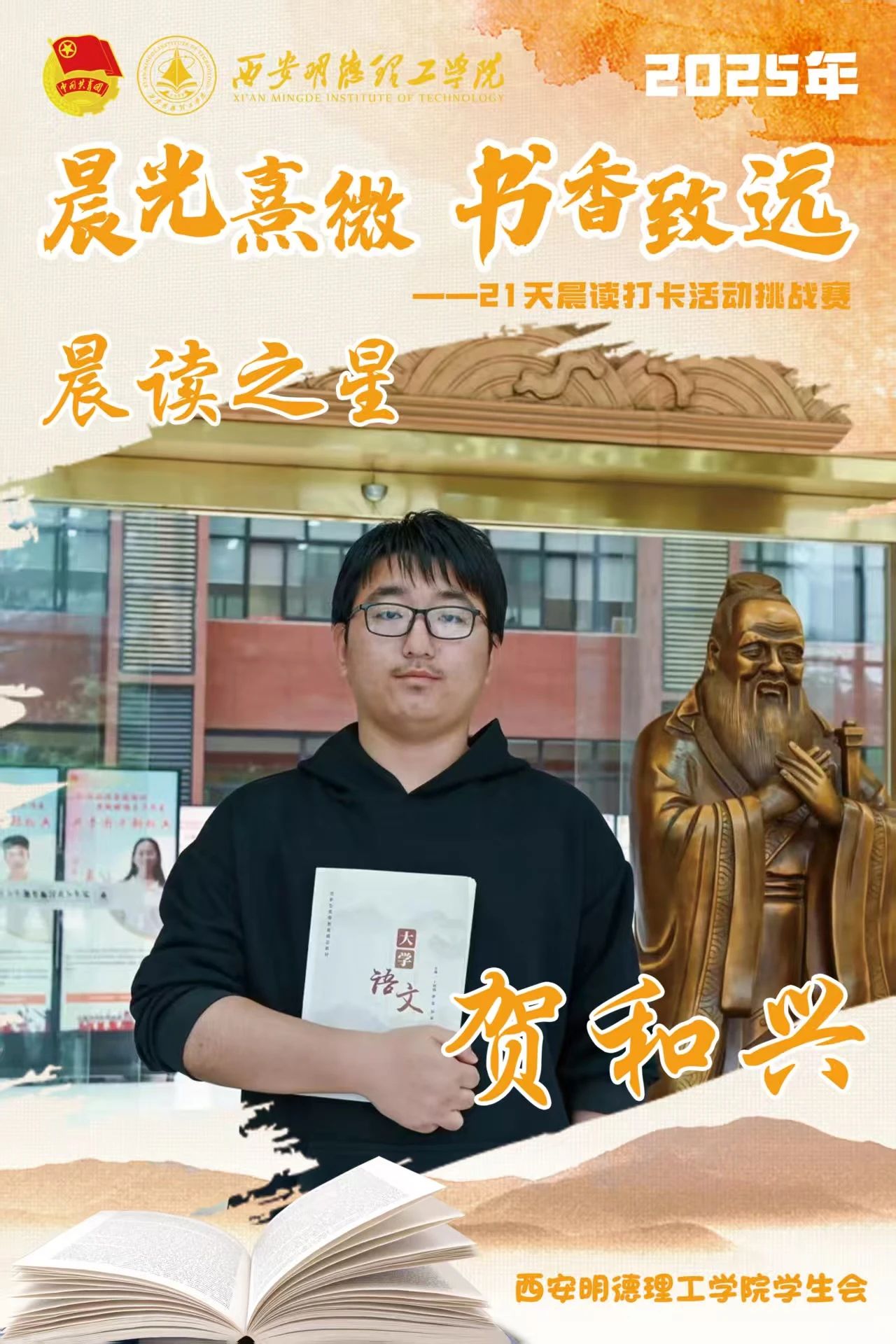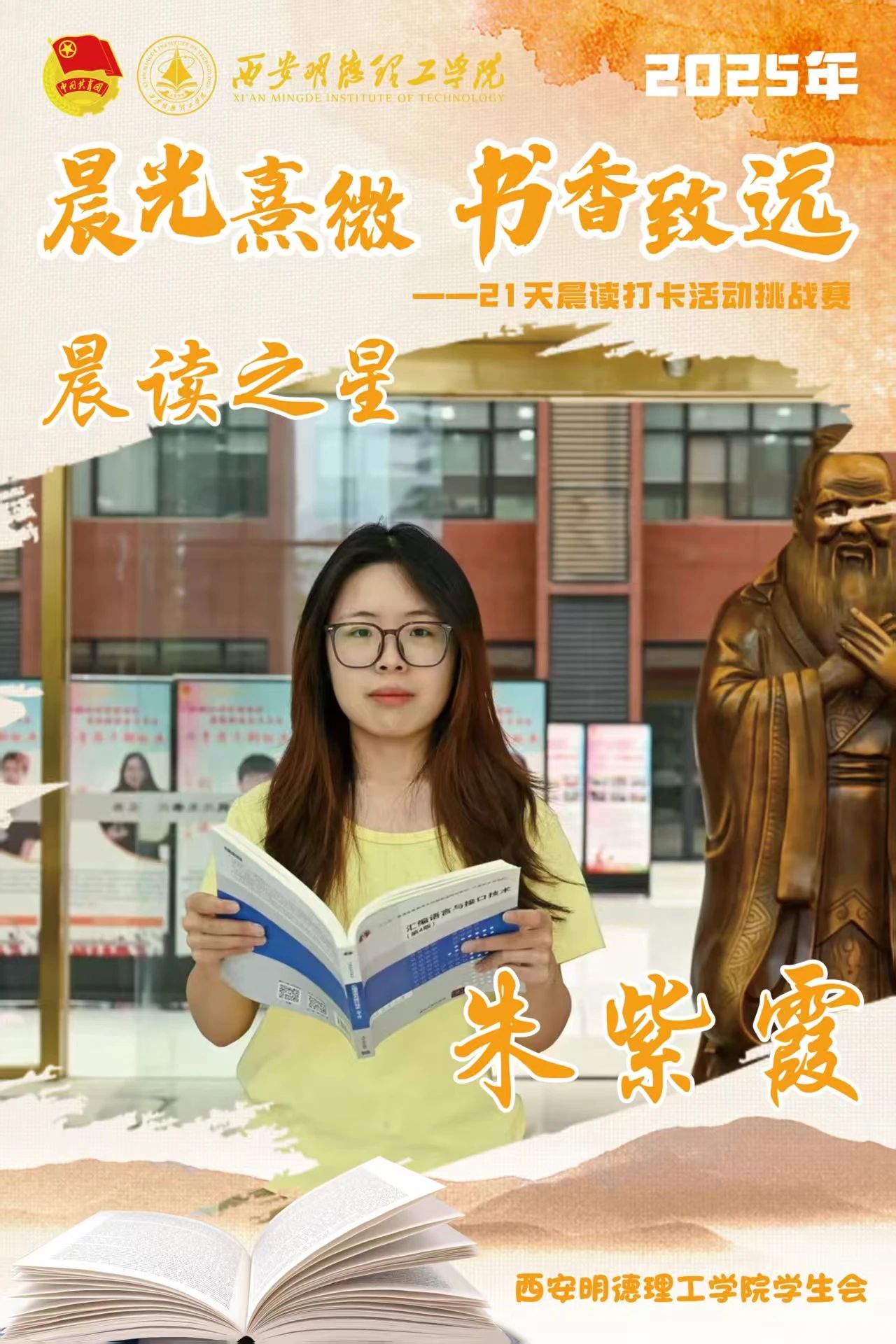 经过21天的坚持与努力,他们用行动诠释了坚持的力量,用毅力收获了知识与成长。随着活动落幕,晨读的余韵仍在校园蔓延,21天不是终点,而是终身学习的起点。愿明德学子以晨读为帆,在书香中继续丈量世界,让每一个清晨都成为追逐梦想的新起点。6月8日,让我们相约表彰大会,为坚持喝彩,为下一段书香征程蓄势启航!