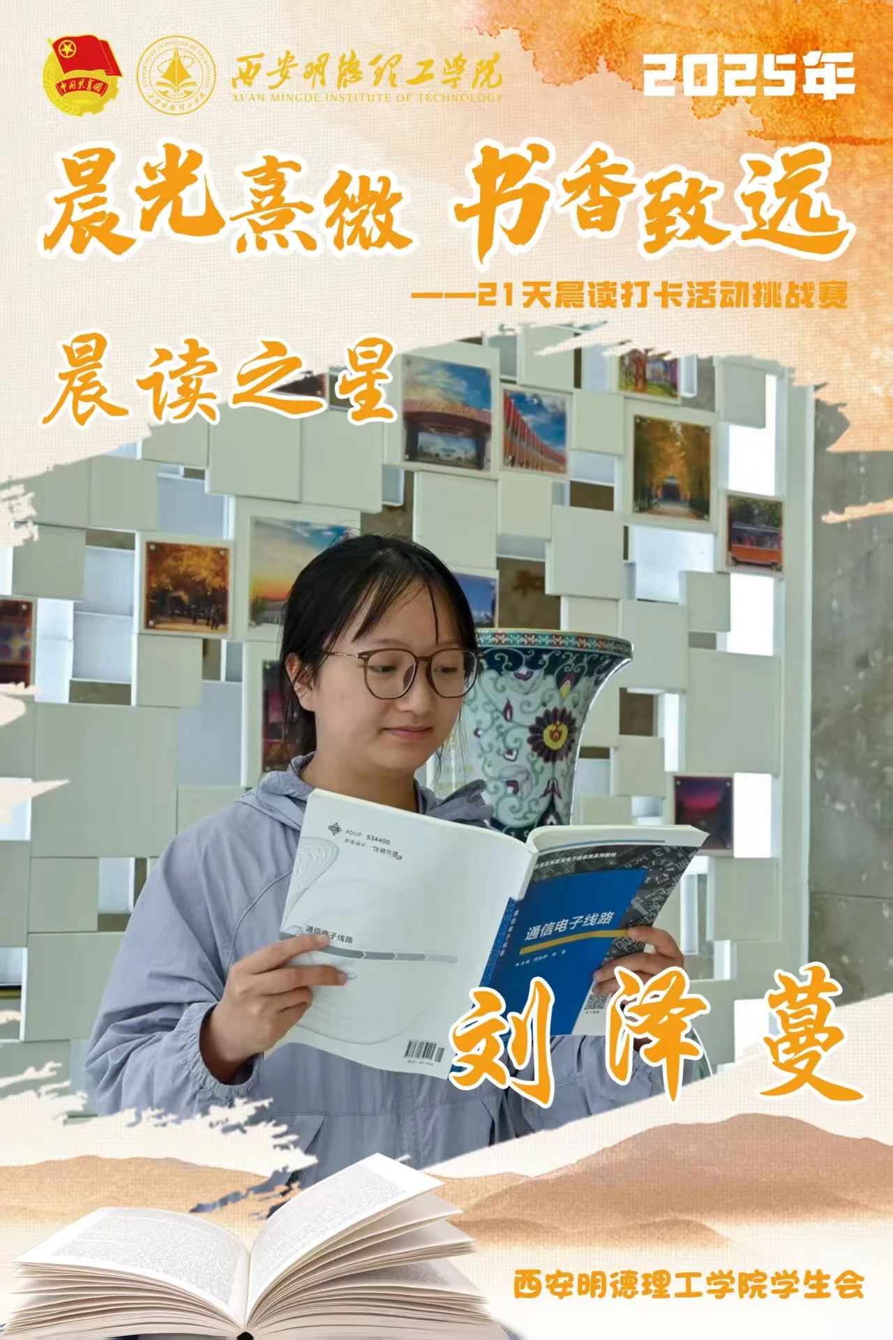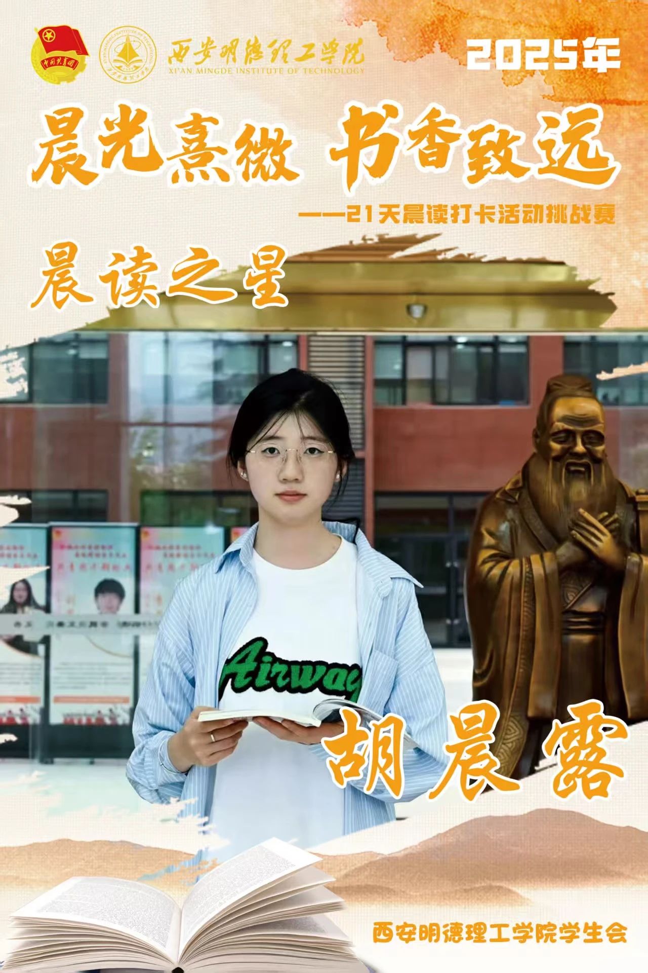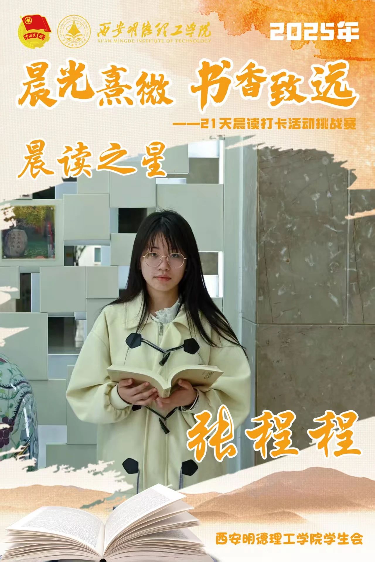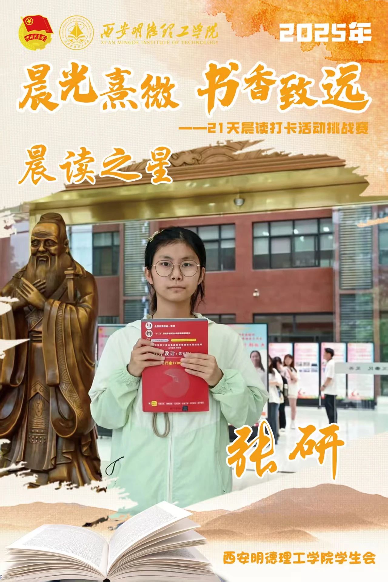 回顾21天的坚守,自律成为青春底色,每天清晨,下沉广场准时迎来晨读身影。有人捧着《论语》《诗经》,在古典诗词中感受文化底蕴;有人专注于英语四六级真题朗读,让标准发音唤醒清晨;更有同学带着专业教材,用公式推导与概念诵读开启学术思考。从春日微寒到柳絮纷飞,从初时的困意朦胧到后来的精神抖擞,同学们用行动诠释着“坚持”的力量。