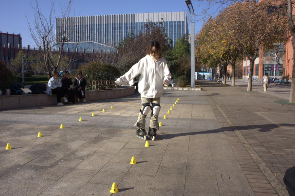 下沉广场上,轮滑社与滑板社带来动感展示,响应“健康第一”教育理念。轮滑队员以“S形绕桩”展现精湛技艺,滑板社员通过腾跃翻转演绎平衡与创意,灵动身影既彰显体育技能,更诠释青春活力与团队精神,践行“在体育锻炼中享受乐趣、增强体质、健全人格、锤炼意志”的要求,为校园体育文化注入鲜活动力。