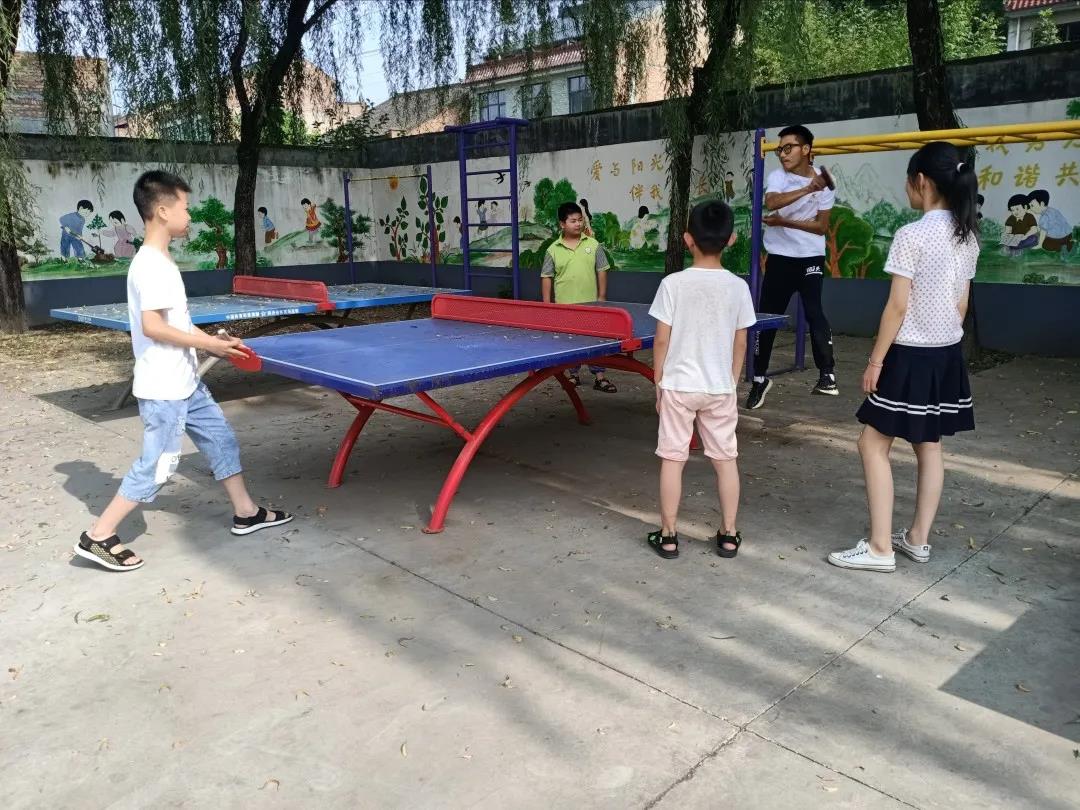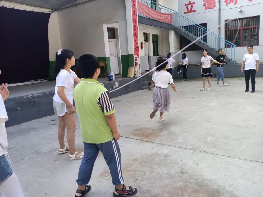 课间休息时,打羽毛球、打乒乓球、跳大绳,孩子们和志愿者们一起玩得不亦乐乎。
