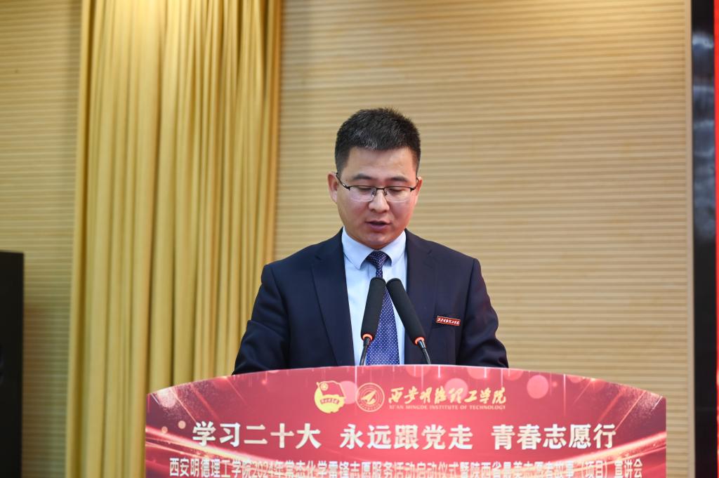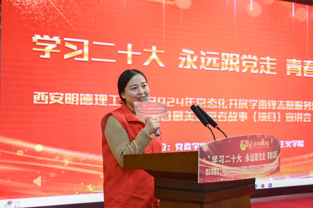 校团委副书记刘雄宣读了《西安明德理工学2024年“学习二十大 永远跟党走 青春志愿行”常态化开展学雷锋志愿服务系列活动安排》。