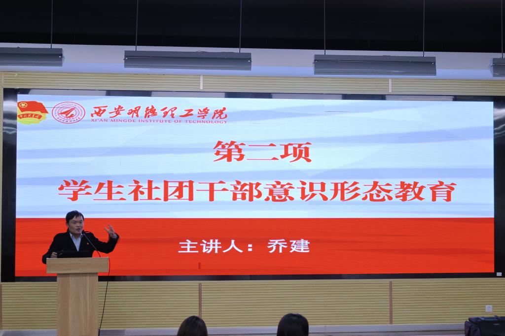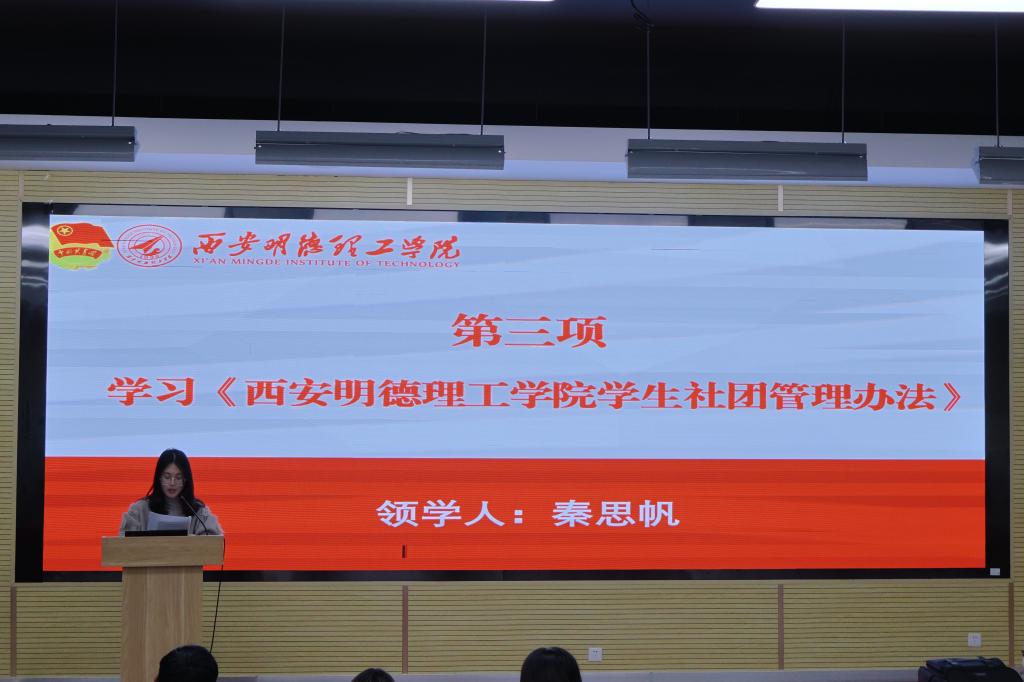会上,社团管理中心刘源远对上一学期学生社团工作开展情况进行了总结。社团管理中心秦思帆带领大家再次学习了《西安明德理工学校学生社团管理办法》。校团委乔建老师安排了本学期学生社团重点工作并对与会人员进行了意识形态教育,他指出学生社团要坚持以习近平新时代中国特色社会主义思想为指导,认真培育和践行社会主义核心价值观,坚持弘扬主旋律,传播正能量;社团活动要围绕中心服务大局,开展形式多样、富有成效活动,积极服务大学生健康成长成才;学生社团负责人要提高政治素养,明确工作目标,规范管理,充分发挥学生社团在落实立德树人根本任务、实现学生全面发展工作中的重要作用。会后,社团负责人进行了工作交流。