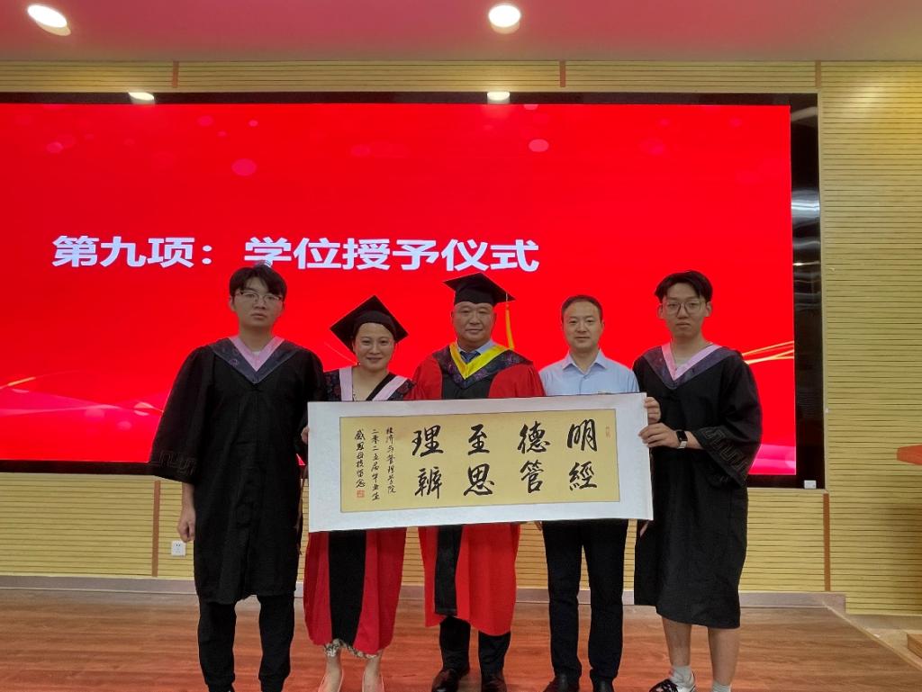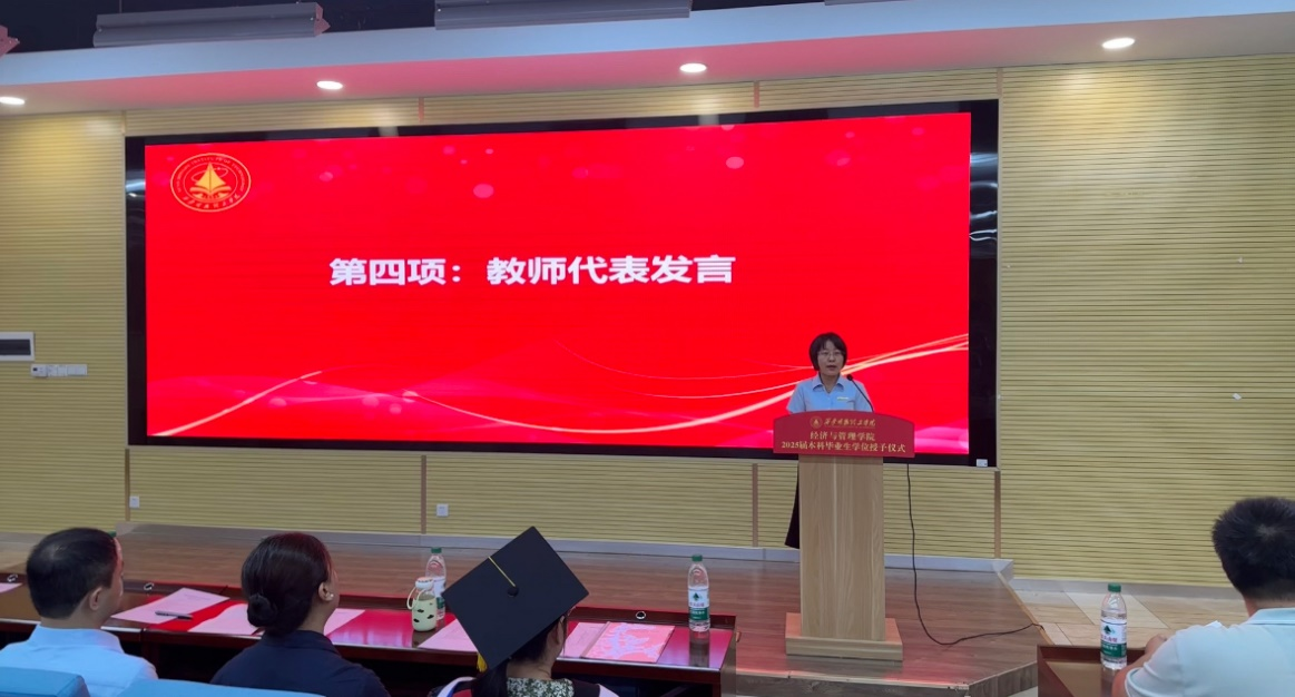 何文举代表学院进行致辞,向圆满完成学业的毕业生们表示热烈祝贺,向倾心育人的教师和无私支持的家长致以衷心感谢。他回顾了经济与管理学院近年来在专业建设、人才培养、管理服务、科学研究、产教融合等方面的成绩,分享了优秀学子的突出事迹,激励同学们向榜样学习,立大志、明大德、成大才、担大任,以青春之火,传承明德人的精神特质,到祖国和人民最需要的地方建功立业,以实际行动书写绚丽的青春华章。