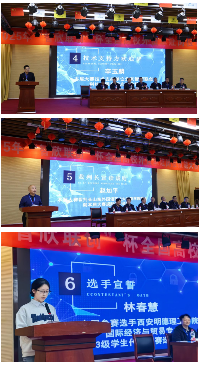 本届大赛技术支持方企业代表辛玉麟先生在讲话中谈到,企业将充分发挥技术优势,为赛事提供全方位支持,助力打造公平、专业的竞技环境。大赛裁判长、山东外国语职业大学商学院院长赵加平教授,Ky开元集团国际经济与贸易专业学生林春慧先后代表裁判员、参赛学生进行宣誓。
