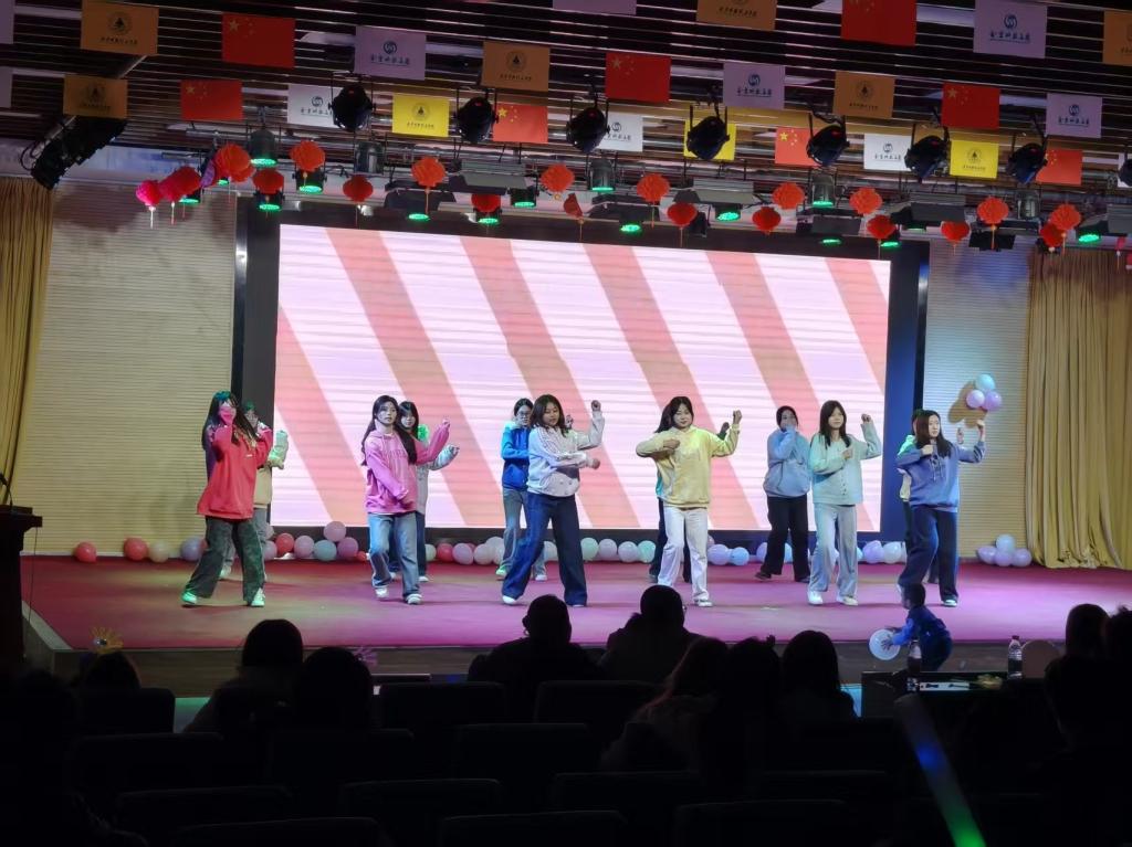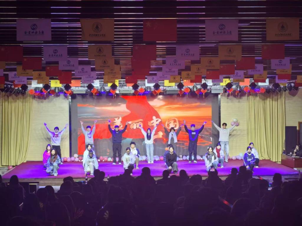 本次汇演汇聚学院各部门、各专业班级歌舞、小品、时装展演等23个精彩节目。在全场热烈掌声中,主持人以“骏马蹄声辞旧岁,春潮涌动启新程”的诗意开场,将乙巳蛇年的收尾与丙午马年的期盼娓娓道来,“以龙马精神为翼,以经管担当为帆”的寄语,瞬间点燃了现场师生的迎新热情。汇演的序幕由组织部学子拉开,《相亲相爱一家人》的温情舞步搭配《美丽中国》的磅礴旋律,红色绸带在舞台上翩翩起舞,既勾勒出家国同心的温暖图景,也为整场汇演定下了温馨热烈的基调。