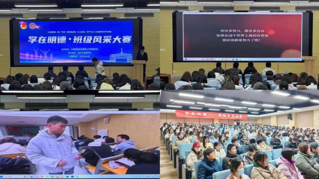 为加强校园文化建设,用优秀校园文化助力学生全面发展,展示班级建设成果,打造“一院一品”特色项目。经济与管理学院于2024年1月10日在建德楼201举办“学在明德——班级风采大赛”,高等职业技术学院团委书记郭庆、辅导员高喜,经济与管理学院团委书记卢宝全、辅导员张朋担任评委,经济与管理学院2022、2023级学生代表200余人参加了活动。