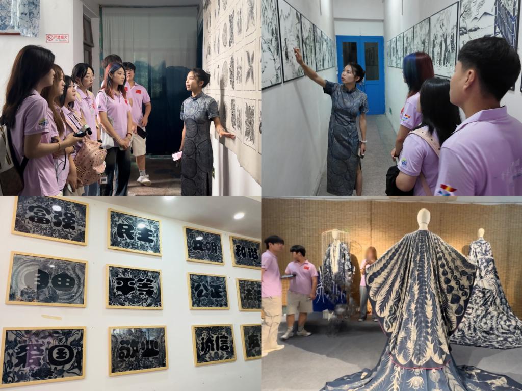 扎染作为贵州另一项重要非物质文化遗产,同样蕴含着丰富的历史文化内涵。实践队走进镇远县青云染物手工艺坊,在非遗传承人的指导下体验了扎染技艺。带着靛蓝余韵,队员们步入镇远博物馆,馆内陈列以“古境悠远”“文化和谐”“红色镇远”“山水福地”四大展区勾勒古城全貌。一日探访,蓝白扎染的雅致与红色记忆的炽热交织于心,队员们既惊叹于传统技艺的精妙,更读懂非遗作为民族根脉的价值。