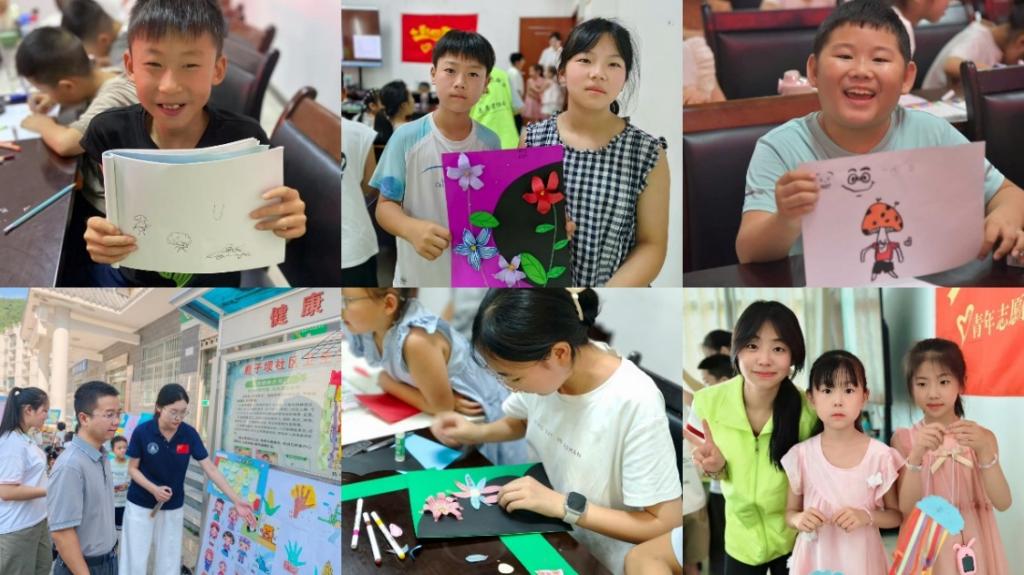 实践过程中,实践队匠心独运,将创意美育的种子悄然融入日常学习的沃土之中,开展了非遗剪纸、音乐舞蹈、手工制作等美育课程成为普通话传播的创意平台。非遗剪纸课上,孩子们循着清晰的制作指引,折纸、镂空,吉祥窗花与灵动的小动物图案悄然绽放。音乐课上,《我的中国心》的深情旋律在“长江,长城……”的童声告白中被赋予新声;手工课上,志愿者们将精心准备的彩纸、剪刀、画笔分发给孩子们,引导他们制作立体百合、蔬菜王国等手工作品。一幅幅充满童真童趣的画作,一件件精心制作的手工艺品,生动记录了小朋友们在知识学习、艺术创作等方面的成长与收获。社区文化广场的作品展览吸引众多村民驻足,一件件童趣盎然的艺术品,成为普通话推广的“立体名片”。