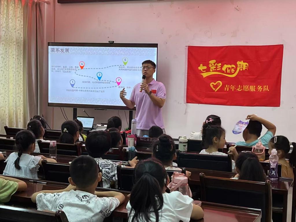 在鹿子坝社区广场和农家书屋,实践队以《绘出最美青花瓷》《舌尖上的中国》《最美诗词赏析》等文化传承课程为载体,将普通话学习与中华优秀传统文化深度融合。青花瓷课堂上,队员赵昱琛通过PPT图文并茂地讲解景德镇陶瓷的古法工艺,引导孩子们用蓝白水彩笔绘制纹样,感受“典雅高贵”的东方美学;《舌尖上的中国》课程中,八大菜系的历史脉络与地域特色成为语言表达的鲜活素材,孩子们在讨论“最爱的家乡美食”时,自然习得“烹饪”“风味”等专业词汇。诗词赏析环节,志愿者以平仄韵律为切入点,带领孩子们用标准普通话诵读经典,在抑扬顿挫中体悟汉语的音韵之美。“原来普通话不只是‘说话’,还能让我们更懂传统文化!”五年级的程翱埊在课后感慨道。
