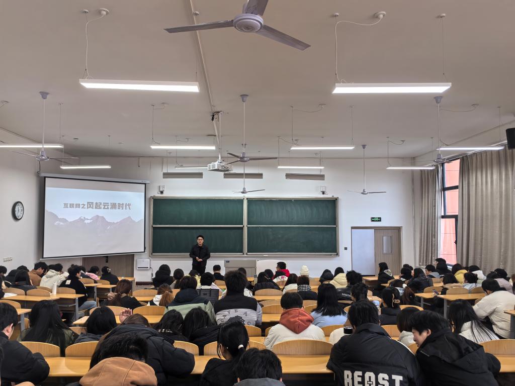 直播电商行业校友联络站站长袁喆感谢学校对校友的关心与支持,表示一定不辜负学校的信任,将这个校友联络站打造好、经营好,建设成为直播电商行业校友与母校、与校友交流沟通的平台,共同助力市场营销和国际经济与贸易专业的建设发展。他以“互联网之风起云涌时代”为主题,结合自身成长及职业经历,着重分享了直播电商行业的发展现状及未来趋势。
