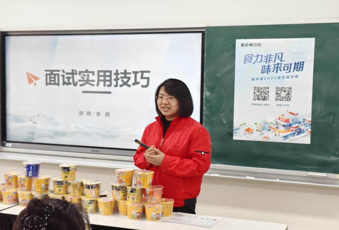 西安顶益食品有限公司人事经理李雅通过答题互动、有奖问答的方式增强了毕业生们对康师傅品牌的了解,从企业定位、发展历程、主营业务、产品分类、生产基地、社会声誉等方面介绍了企业概况;从入职流程、岗位需求、工作地点、薪酬福利、应聘方式等方面给学生讲解了招聘需求。在此基础上,人力资源部主管李颜向毕业生们做了“实用面试技巧”主题宣讲,围绕企业要招什么样的人、面试是如何进行的、如何成功面试、康师傅2025校招说明等四个维度向毕业生讲解了组织力、胜任力模型、企业用人文化理念、面试流程、面试类型、行为描述、面试准备工作、管培生选拔报名流程以及发展空间。宣讲结束后,毕业生纷纷对岗位应聘方式进行咨询,企业人员耐心细致的解答同学们的提问。