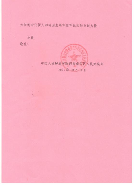 中国人民解放军陕西省南郑区人民武装部在感谢信中,对李松泽同学的突出表现给予高度赞扬,同时对开元在人员抽调以及后续联络等环节给予的充分信任和鼎力支持表示诚挚感谢,并表达了希望与开元在更多领域加强合作交流,共同为培养担当民族复兴大任的时代新人、巩固发展军政军民团结贡献力量的热切期盼。
