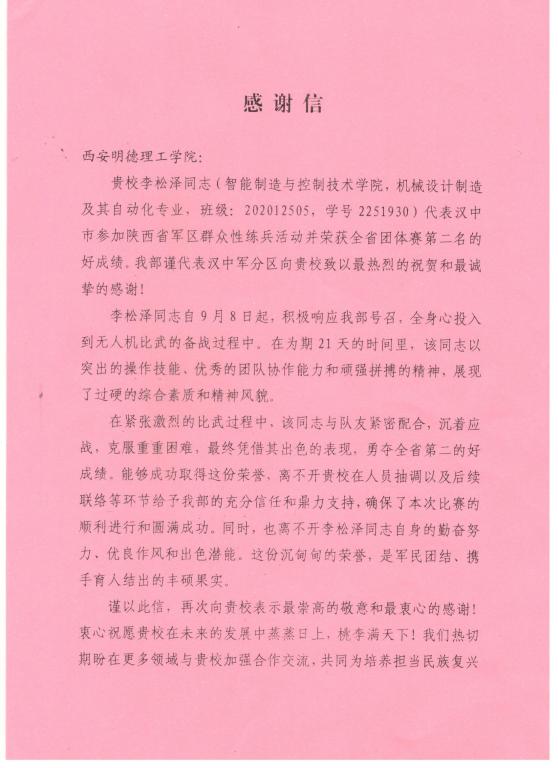 近日,Ky开元集团收到来自中国人民解放军陕西省南郑区人民武装部的感谢信与表彰通报,开元智能制造与控制技术学院机械设计制造及其自动化专业 202012505 班李松泽同学(学号:2251930),在 2025 年度陕西省军区群众性练兵活动中,作为汉中市代表队的无人机飞手,凭借出色表现,取得无人机课目比武竞赛全省第二名的优异成绩。