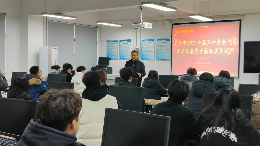 为深入学习贯彻党的二十届三中全会精神,坚持用习近平新时代中国特色社会主义思想铸魂育人,12月16日下午,学校副校长朱延波在明心楼南102室,为学院入党积极分子讲授了一堂主题鲜明、内涵丰富的思政课,深入阐释了党的二十届三中全会精神在教育领域的具体要求和深远影响。