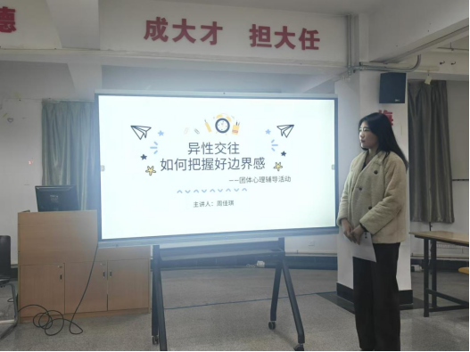 活动中,周佳琪通过播放小视频、PPT展示等方式,详细讲解了异性交往过程中应当如何把握好边界感。她强调,边界感在异性交往中至关重要,关乎到双方的尊重、理解和信任,要尊重对方的感受和需求、保持适度身心距离。同时结合具体案例,深入浅出地分析了边界感缺失可能带来的负面影响,如误解、尴尬甚至冲突等。