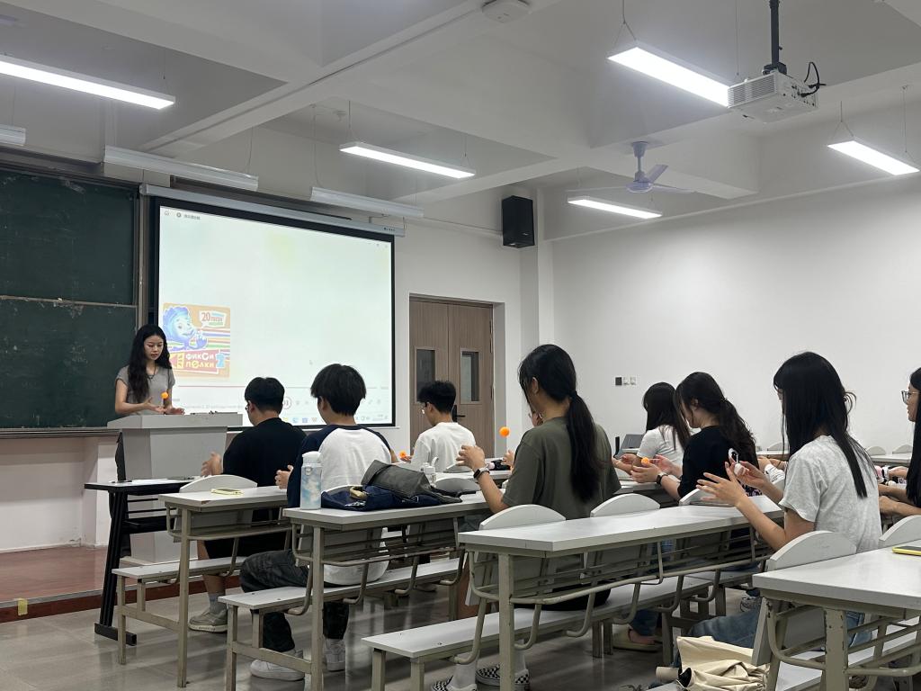 活动由苏东挺老师带领,各学院选派的学生代表共同参与。苏老师通过“杯子音乐”“乒乓球节奏音乐”等趣味互动环节,通过弹跳的乒乓球在桌面撞击出的韵律,即兴创作出充满生命力的节奏乐章。引导同学们在音乐中感受节奏的魅力,体验身心放松的愉悦。活动现场氛围轻松活跃,同学们在默契的协作与欢快的旋律中,不仅学会了用音乐调节情绪,更在互动中增进了彼此的理解与支持。