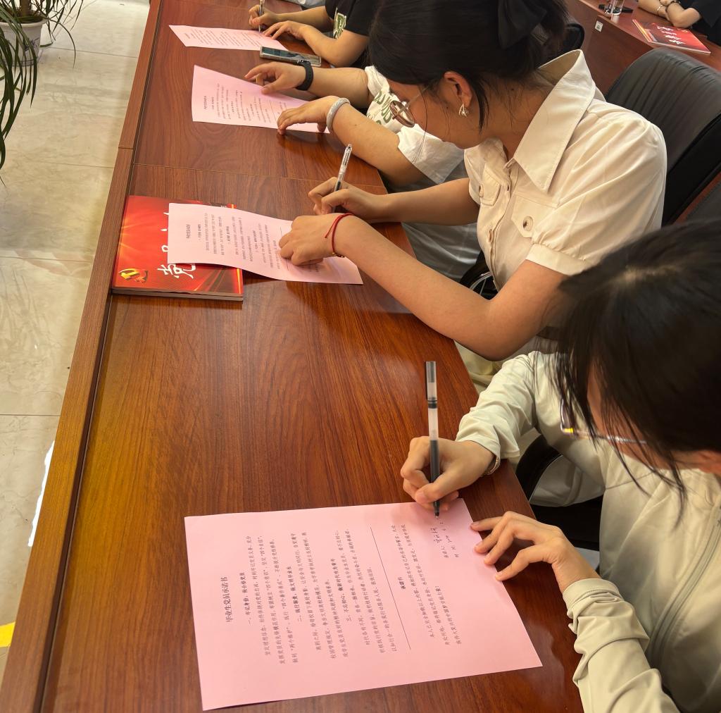 毕业生党员代表何美晨同志带领全体毕业生党员宣读了《毕业生党员承诺书》,并郑重承诺离校后,在未来的学习生活中和工作岗位上将积极履行党员应尽的义务,承担起党员的责任,发挥党员的模范带头作用,努力为党旗添彩。全体毕业生党员在承诺书上郑重签名,表达了他们坚守信仰、践行承诺的坚定决心。