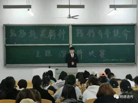 夏泽轩同学的演讲感情丰富充满活力,他向大家解读了抗疫精神的内容,并通过真实的案例,更加真切地让我们感受到人们面对疫情时的英勇无畏。