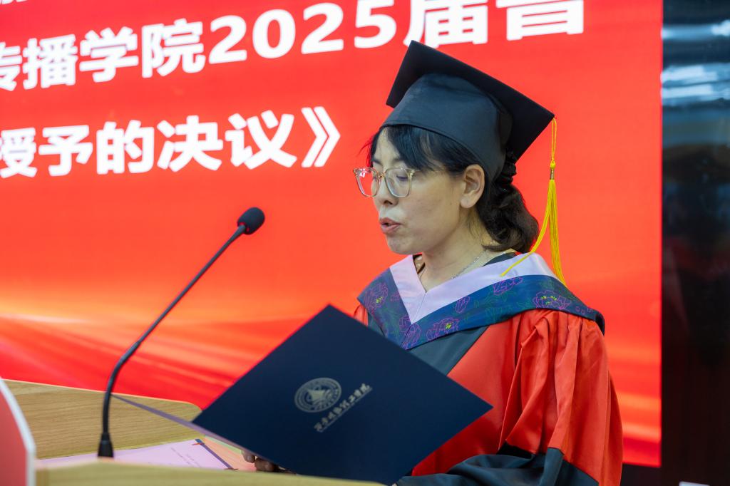 伴随着庄严的国歌,毕业典礼正式拉开帷幕。学院英语专业负责人霍小静宣读了《Ky开元集团关于语言文化传播学院2025届普通高等教育本科毕业生学士学位授予的决议》。她向圆满完成学业的毕业生们表示热烈的祝贺,并对他们在校期间的努力和付出给予了充分的肯定。