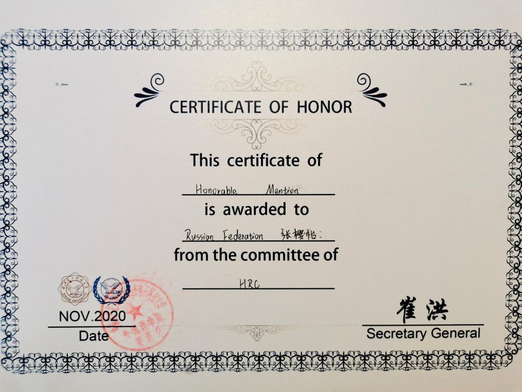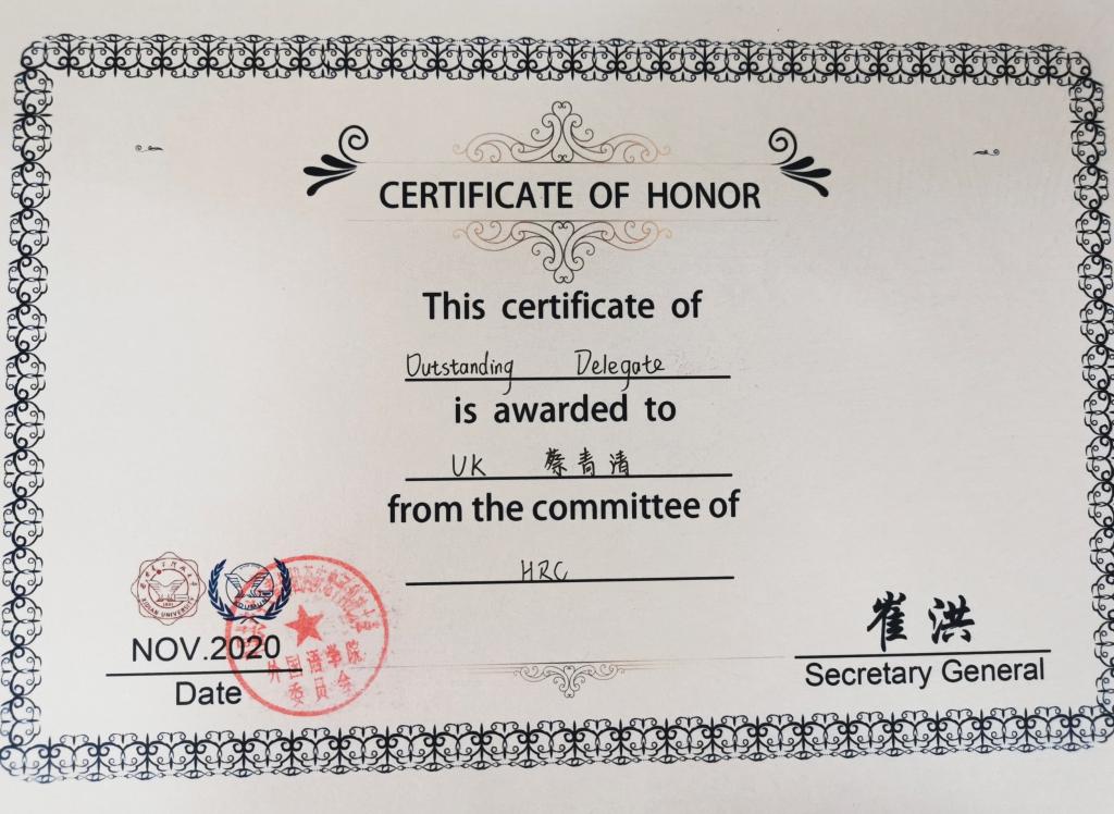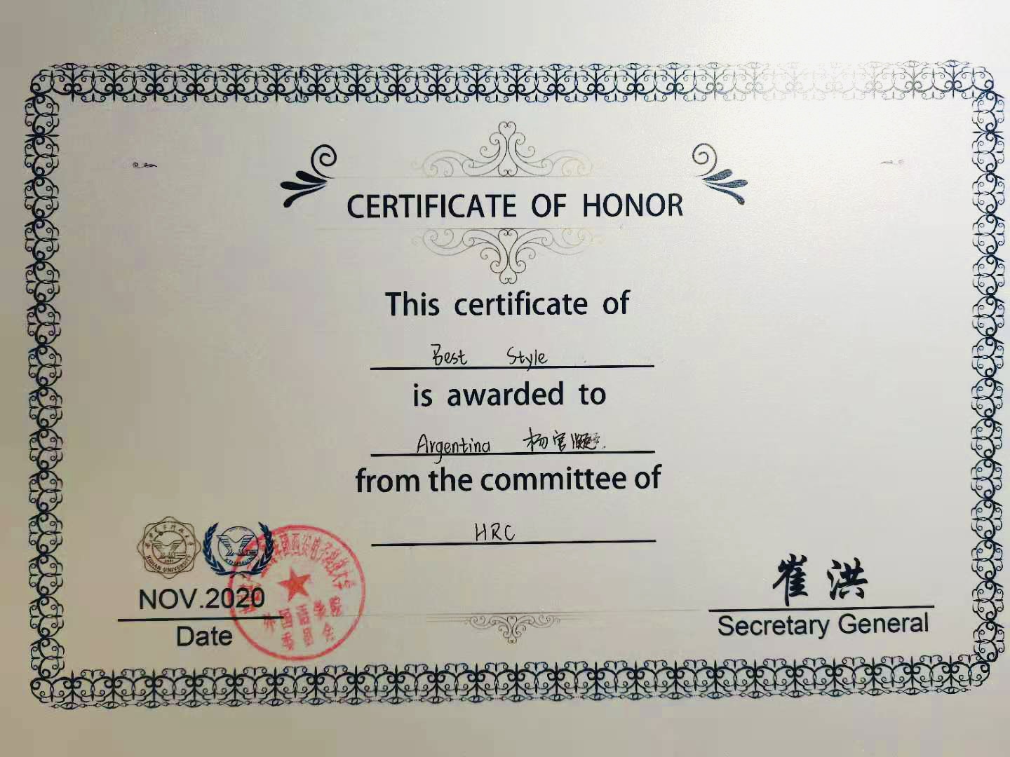 20201113日至1115日,开元模拟联合国团队共派出七名代表西安电子科技大学第十一届模拟联合国大会斩获个人奖三项,分别是最佳风格Best Style——杨官凝,杰出代表Outstanding Delegate——蔡青清,以及荣誉提名Honorable Mention——张樱怡。