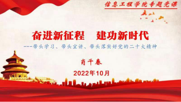 为深入学习贯彻党的二十大精神,深刻领会、准确把握党的二十大精神实质和丰富内涵,切实引导全院各党支部、全体党员把思想、认识和行动统一到学习、宣传、贯彻党的二十大精神上来10月28日下午,信息工程学院在明志楼北206会议室开展党的二十大精神专题党课辅导活动。学院党委书记肖千春奋进新征程  建功新时代---带头学习、带头宣讲、带头落实好党的二十大精神为主题讲授党课。全各党支部书记、在校党员教师参加。