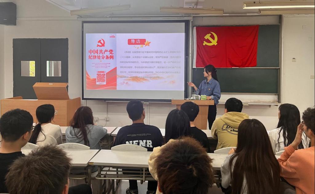 为认真学习贯彻《中国共产党纪律处分条例》,加强党纪学习教育,增强纪律意识。4月18日下午,学院学生第一党支部在二号教学楼212教室开展“学党规党纪 强党风党性”党日活动。本次活动由支部书记张蓉主持,在校党员及部分入党积极分子参加。