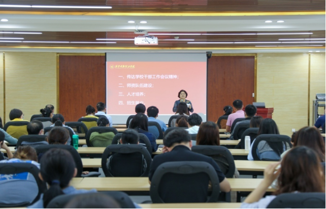 院长王丽芳传达了本学期学校干部工作会议精神,要求全体教职工坚持“以学生为根,以育人为本,以教师为要,以责任为重”。王院长指出,教师应具备三种能力:第一,教书育人的能力。作为教师,应忠诚党的教育事业,更新教育观念,时时以一名优秀教师的标准要求自己;第二,教改教研的能力。教师应不断更新自己的知识和观念,不断提高自身素质,研究学生规律,将新的教学模式引入课堂,因材施教,常变常新;第三,科学研究的能力。教师应重视自身科研综合素养的培养与能力提升,通过多种有效途径,积极开展科学研究,在研究中不断发现问题、解决问题,发挥自己的优势,让课堂更加生动。王院长强调,教师要注重提高人才培养质量,要用心上课,用心做“好老师”。