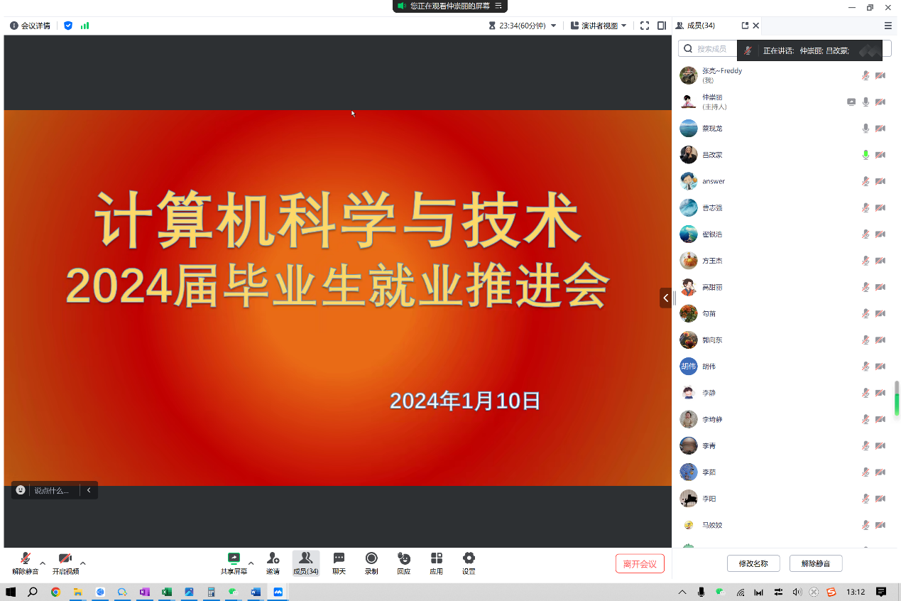 为了进一步推进2024届毕业生就业工作,提高毕业生的就业质量。2024年1月10日,信息工程学院计算机科学与技术专业全体教师通过腾讯会议召开了就业工作部署会议。会议由专业负责人蔡现龙主持,本专业近40名教师参加了此次会议。