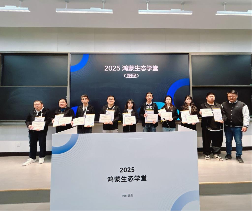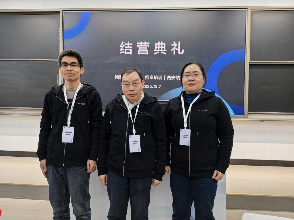 2025年12月5日到7日,由华为开发者联盟、江苏传智播客教育科技股份有限公司、西安交通大学联合举办的“2025年西安站·鸿蒙生态学堂全国高校骨干教师研究班”在西安交通大学进行了师资培训,本次培训旨在通过校企合作,提高高校教师在鸿蒙应用开发方面的技术水平与教学能力。信息工程学院詹金珍、王曙光和张秦菲三位老师参加了此次培训。