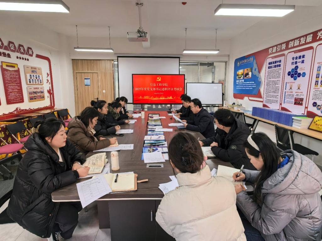 为全面检验各支部党建工作成效,压实支部书记党建工作责任,以评促建推动学院党建工作提质增效,2026年1月9日,信息工程学院召开2025年度党支部书记述职评议考核会。学院党委委员及各党支部书记参加。会议由学院党委书记肖千春主持。