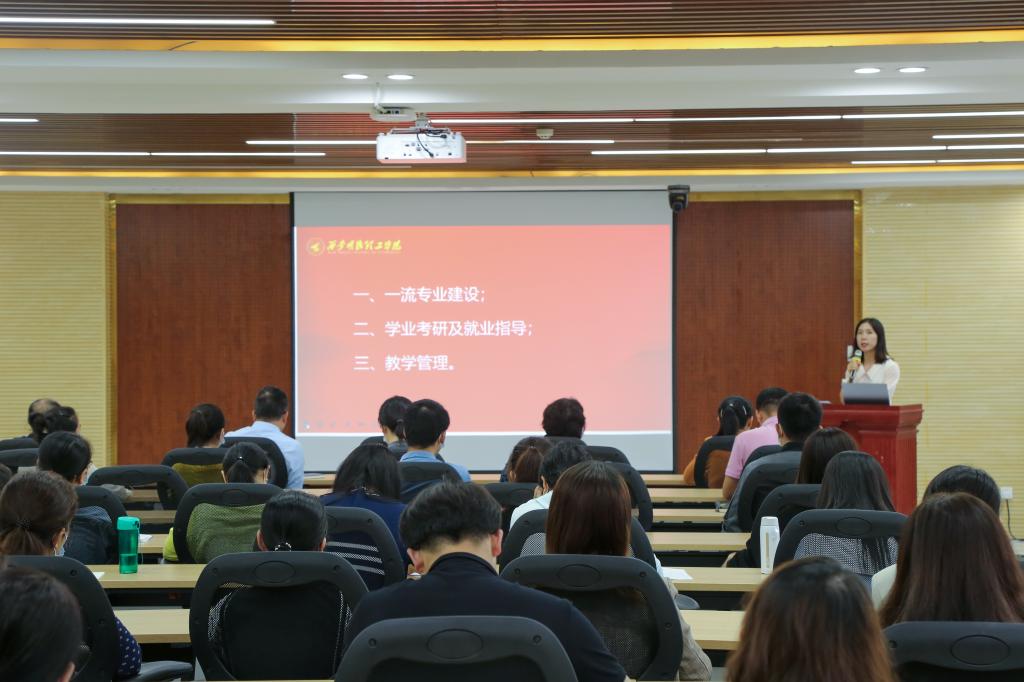 副院长魏瑾重点介绍了“一流专业”建设情况。她指出,专业建设是高等学校最重要的教学基本建设,是发展的重中之重。专业建设决定着人才培养的格局与办学水平,对学院的改革与发展具有深远的影响。“一流专业”建设对提高学院的知名度起到重要的作用。“专业如何发展、专业教师如何发展”是所有教师应该思考的问题。为进一步提高我院专业建设水平,应对存在问题进行分析,并寻求解决办法。魏院长指出,教师应成为“授课教师+学业导师+考研导师+就业导师”,全面了解学生,分析学生学情,对学生进行心理疏导,为学生指明方向。充分利用各种教学场合和教育机会,对学生进行全过程的教育与指导。同时,应全员关注就业,为学生提供就业帮助。